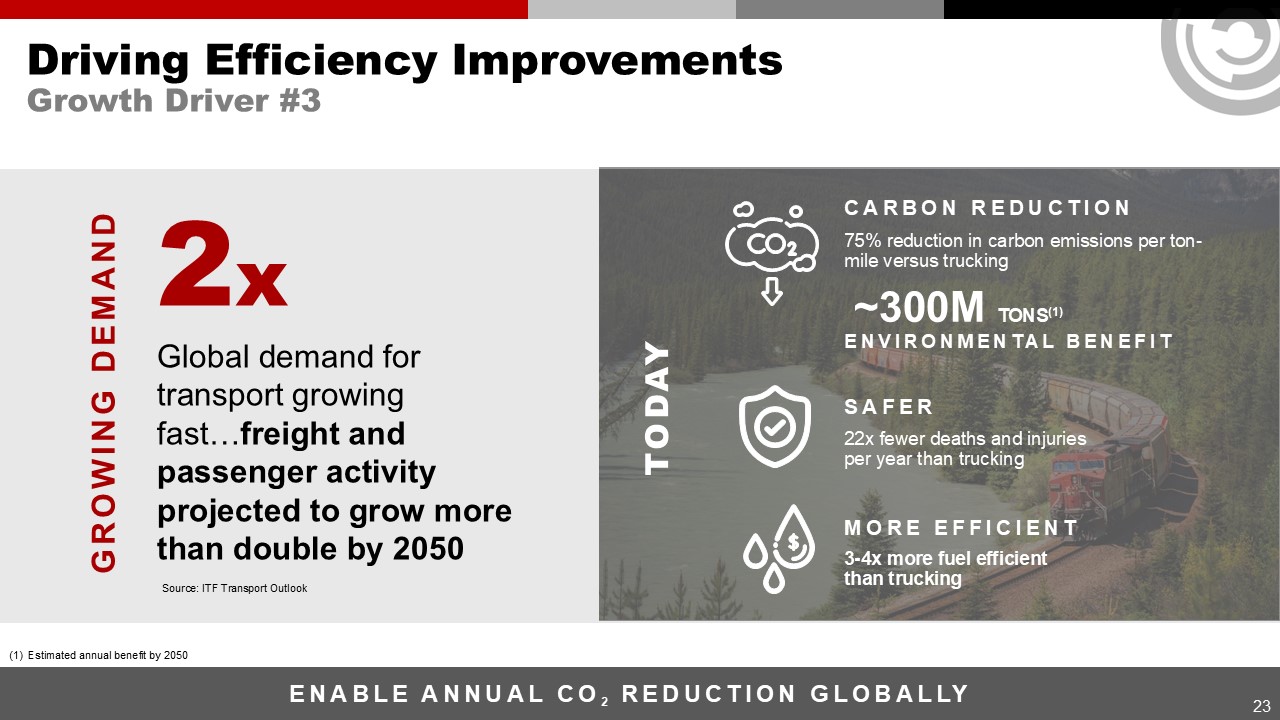 ENABLE ANNUAL CO2 REDUCTION GLOBALLY  Driving Efficiency Improvements  Growth Driver #3  23  2x  Global demand for transport growing fast…freight and passenger activity projected to grow more than double by 2050  GROWING DEMAND  Source: ITF Transport Outlook  (1) Estimated annual benefit by 2050  22x fewer deaths and injuries per year than trucking  SAFER  75% reduction in carbon emissions per ton-mile versus trucking   CARBON REDUCTION  3-4x more fuel efficientthan trucking  MORE EFFICIENT  Environmental BENEFIT  ~300M TONS(1)   TODAY