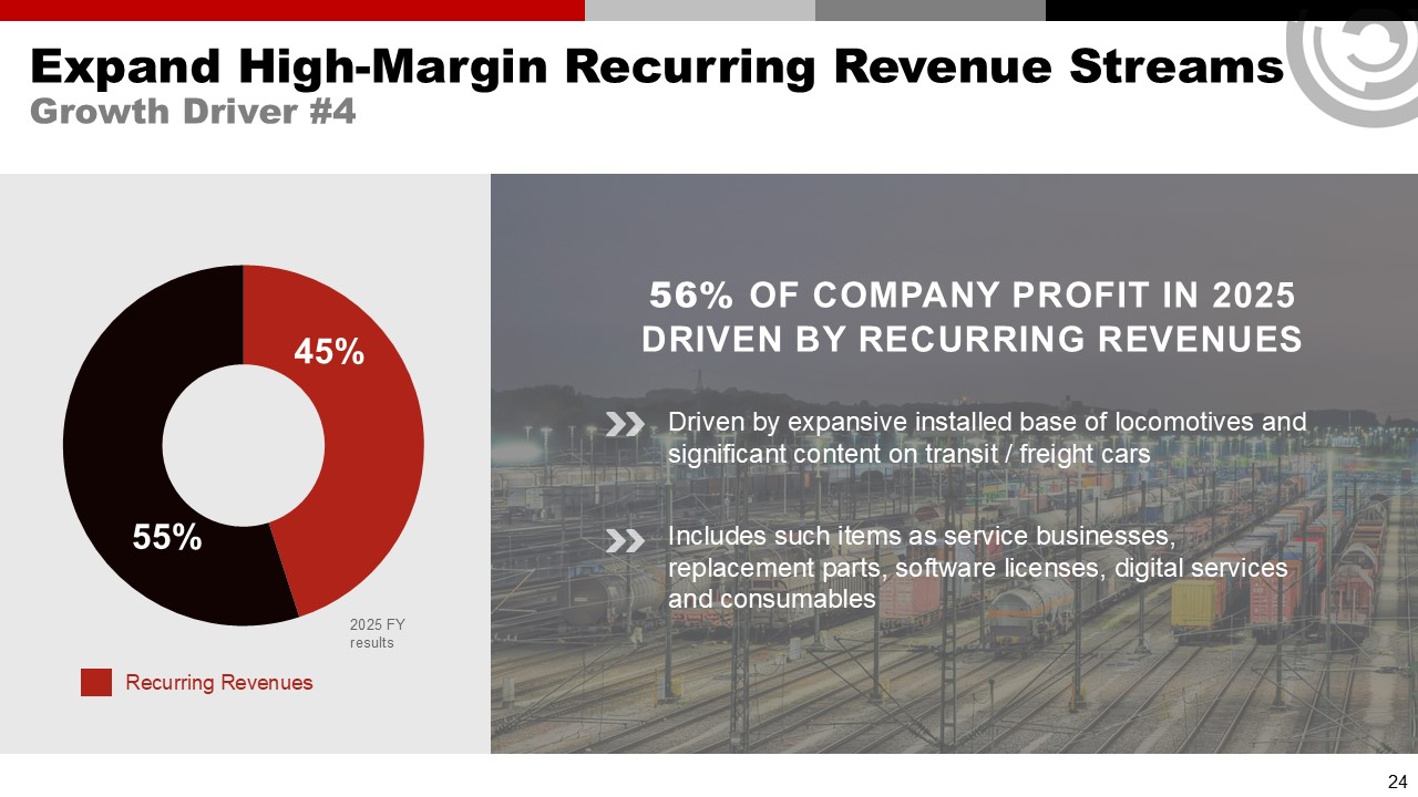 Expand High-Margin Recurring Revenue Streams  Growth Driver #4  24  56% OF COMPANY PROFIT IN 2025 DRIVEN BY RECURRING REVENUES  Driven by expansive installed base of locomotives and significant content on transit / freight cars  Includes such items as service businesses, replacement parts, software licenses, digital services and consumables  45%  55%  Recurring Revenues  2025 FY results