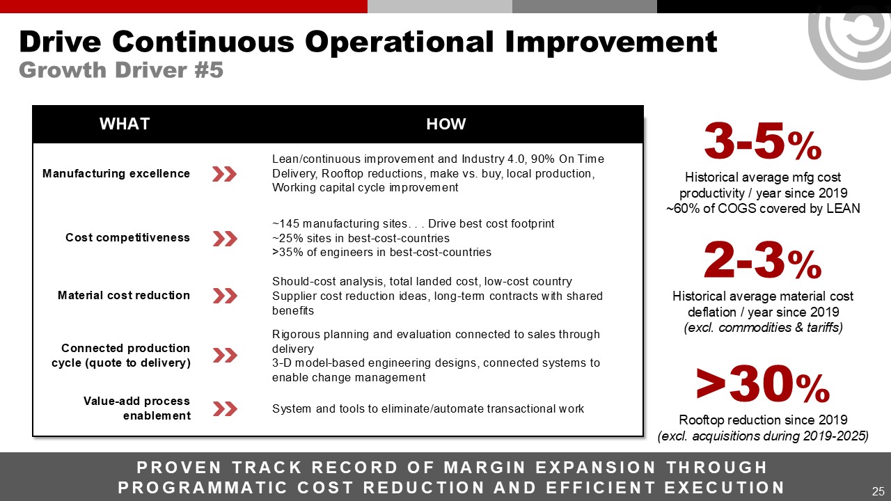 Manufacturing excellence  Lean/continuous improvement and Industry 4.0, 90% On Time Delivery, Rooftop reductions, make vs. buy, local production,  Working capital cycle improvement  Cost competitiveness  Material cost reduction  ~145 manufacturing sites. . . Drive best cost footprint  ~25% sites in best-cost-countries  >35% of engineers in best-cost-countries  Should-cost analysis, total landed cost, low-cost country  Supplier cost reduction ideas, long-term contracts with shared benefits  Connected production cycle (quote to delivery)  Rigorous planning and evaluation connected to sales through delivery  3-D model-based engineering designs, connected systems to enable change management  Value-add process enablement  System and tools to eliminate/automate transactional work  PROVEN TRACK RECORD OF MARGIN EXPANSION THROUGH PROGRAMMATIC COST REDUCTION AND EFFICIENT EXECUTION  Drive Continuous Operational Improvement  Growth Driver #5  25  3-5%  Historical average mfg cost productivity / year since 2019  ~60% of COGS covered by LEAN  2-3%  Historical average material cost deflation / year since 2019 (excl. commodities & tariffs)  >30%  Rooftop reduction since 2019  (excl. acquisitions during 2019-2025)  WHAT HOW