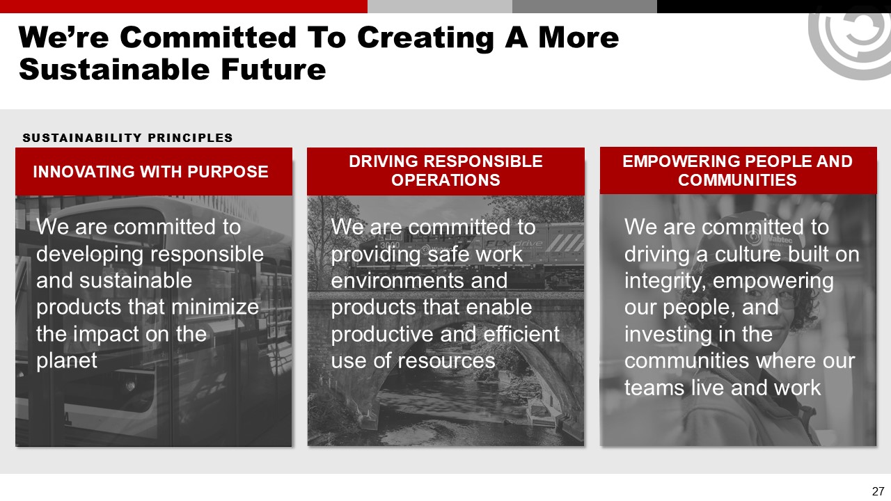 We’re Committed To Creating A More Sustainable Future  SUSTAINABILITY PRINCIPLES  INNOVATING WITH PURPOSE  DRIVING RESPONSIBLE OPERATIONS  EMPOWERING PEOPLE AND COMMUNITIES  We are committed to developing responsible and sustainable products that minimize the impact on the planet  We are committed to providing safe work environments and products that enable productive and efficient use of resources  We are committed to driving a culture built on integrity, empowering our people, and investing in the communities where our teams live and work  27