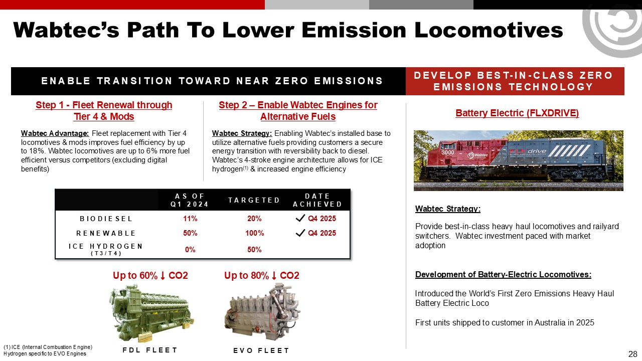 AS OFQ1 2024  TARGETED  DATE ACHIEVED  BIODIESEL  11%  20%   Q4 2025  RENEWABLE  50%  100%   Q4 2025  ICE HYDROGEN (T3/T4)  0%  50%  Wabtec’s Path To Lower Emission Locomotives  Up to 60% CO2   Up to 80% CO2   DEVELOP BEST-IN-CLASS ZERO EMISSIONS Technology  FDL FLEET  EVO FLEET  Wabtec Advantage: Fleet replacement with Tier 4 locomotives & mods improves fuel efficiency by up to 18%. Wabtec locomotives are up to 6% more fuel efficient versus competitors (excluding digital benefits)  Wabtec Strategy:   Provide best-in-class heavy haul locomotives and railyard switchers. Wabtec investment paced with market adoption  Development of Battery-Electric Locomotives:   Introduced the World’s First Zero Emissions Heavy Haul Battery Electric Loco  First units shipped to customer in Australia in 2025  Step 1 - Fleet Renewal through   Tier 4 & Mods  Battery Electric (FLXDRIVE)  (1) ICE (Internal Combustion Engine) Hydrogen specific to EVO Engines  Wabtec Strategy: Enabling Wabtec’s installed base to utilize alternative fuels providing customers a secure energy transition with reversibility back to diesel. Wabtec’s 4-stroke engine architecture allows for ICE hydrogen(1) & increased engine efficiency  Step 2 – Enable Wabtec Engines for Alternative Fuels  ENABLE TRANSITION TOWARD NEAR ZERO Emissions  28