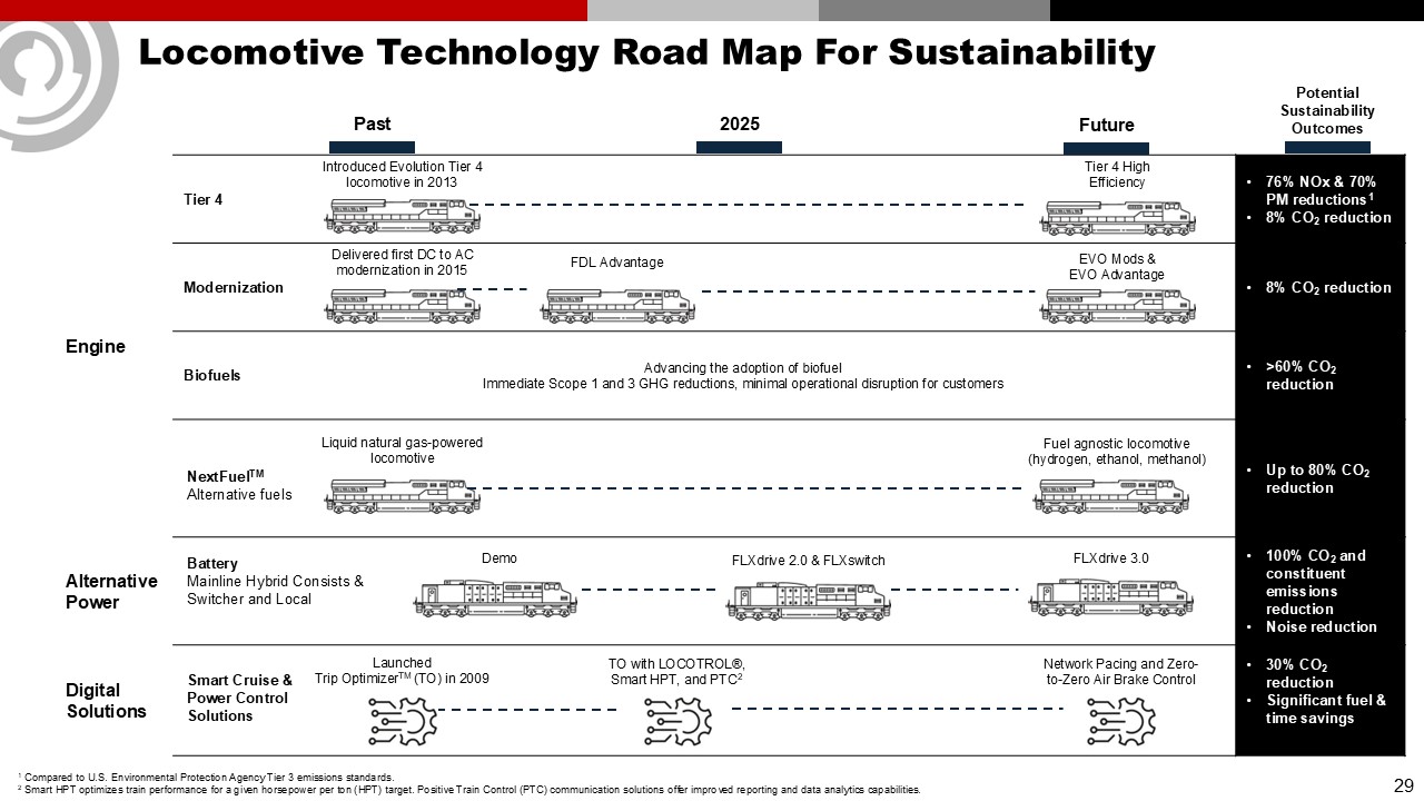 Locomotive Technology Road Map For Sustainability  Engine  Tier 4   76% NOx & 70% PM reductions1  8% CO2 reduction  Modernization  8% CO2 reduction  Biofuels  >60% CO2 reduction  Up to 80% CO2 reduction  Alternative Power  100% CO2 and constituent emissions reduction  Noise reduction  Digital Solutions  30% CO2 reduction  Significant fuel & time savings  Past  2025  Future  Introduced Evolution Tier 4 locomotive in 2013  Tier 4 High Efficiency  Potential Sustainability Outcomes  Delivered first DC to AC modernization in 2015  EVO Mods & EVO Advantage  FDL Advantage  Advancing the adoption of biofuel  Immediate Scope 1 and 3 GHG reductions, minimal operational disruption for customers  Launched   Trip OptimizerTM (TO) in 2009  Demo  FLXdrive 2.0 & FLXswitch  FLXdrive 3.0  Battery   Mainline Hybrid Consists & Switcher and Local  NextFuelTM  Alternative fuels  Smart Cruise & Power Control Solutions  Liquid natural gas-powered locomotive  Fuel agnostic locomotive  (hydrogen, ethanol, methanol)   TO with LOCOTROL®, Smart HPT, and PTC2  1 Compared to U.S. Environmental Protection Agency Tier 3 emissions standards.  2 Smart HPT optimizes train performance for a given horsepower per ton (HPT) target. Positive Train Control (PTC) communication solutions offer improved reporting and data analytics capabilities.   Network Pacing and Zero-to-Zero Air Brake Control  29