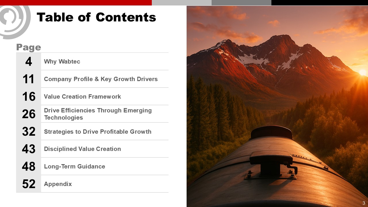 Table of Contents  4  Why Wabtec  11  Company Profile & Key Growth Drivers  16  Value Creation Framework  26  Drive Efficiencies Through Emerging Technologies  32  Strategies to Drive Profitable Growth  43  Disciplined Value Creation  48  Long-Term Guidance  52  Appendix  Page  3