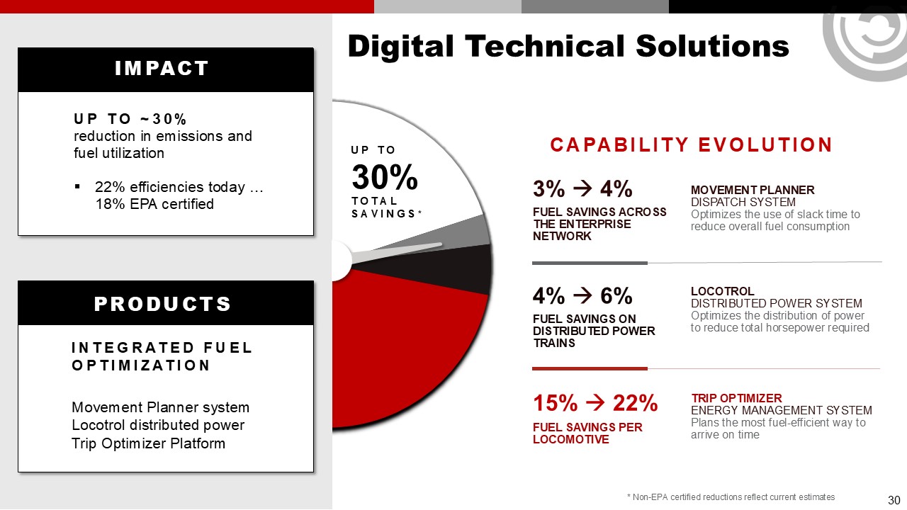 Digital Technical Solutions   30%  UP TO  Total savings*  CAPABILITY EVOLUTION  Fuel savings across   the enterprise   network  3%  4%  Fuel savings on   distributed power   trains  4%  6%  15%  22%  MOVEMENT PLANNER   DISPATCH SYSTEM  Optimizes the use of slack time to reduce overall fuel consumption  LOCOTROL   DISTRIBUTED POWER SYSTEM  Optimizes the distribution of power to reduce total horsepower required  TRIP OPTIMIZER   ENERGY MANAGEMENT SYSTEMPlans the most fuel-efficient way to arrive on time  * Non-EPA certified reductions reflect current estimates   impact  Up to ~30%  reduction in emissions and fuel utilization  22% efficiencies today … 18% EPA certified  products  Integrated FUEL Optimization  Movement Planner system  Locotrol distributed power  Trip Optimizer Platform  30  Fuel savings PER   LOCOMOTIVE