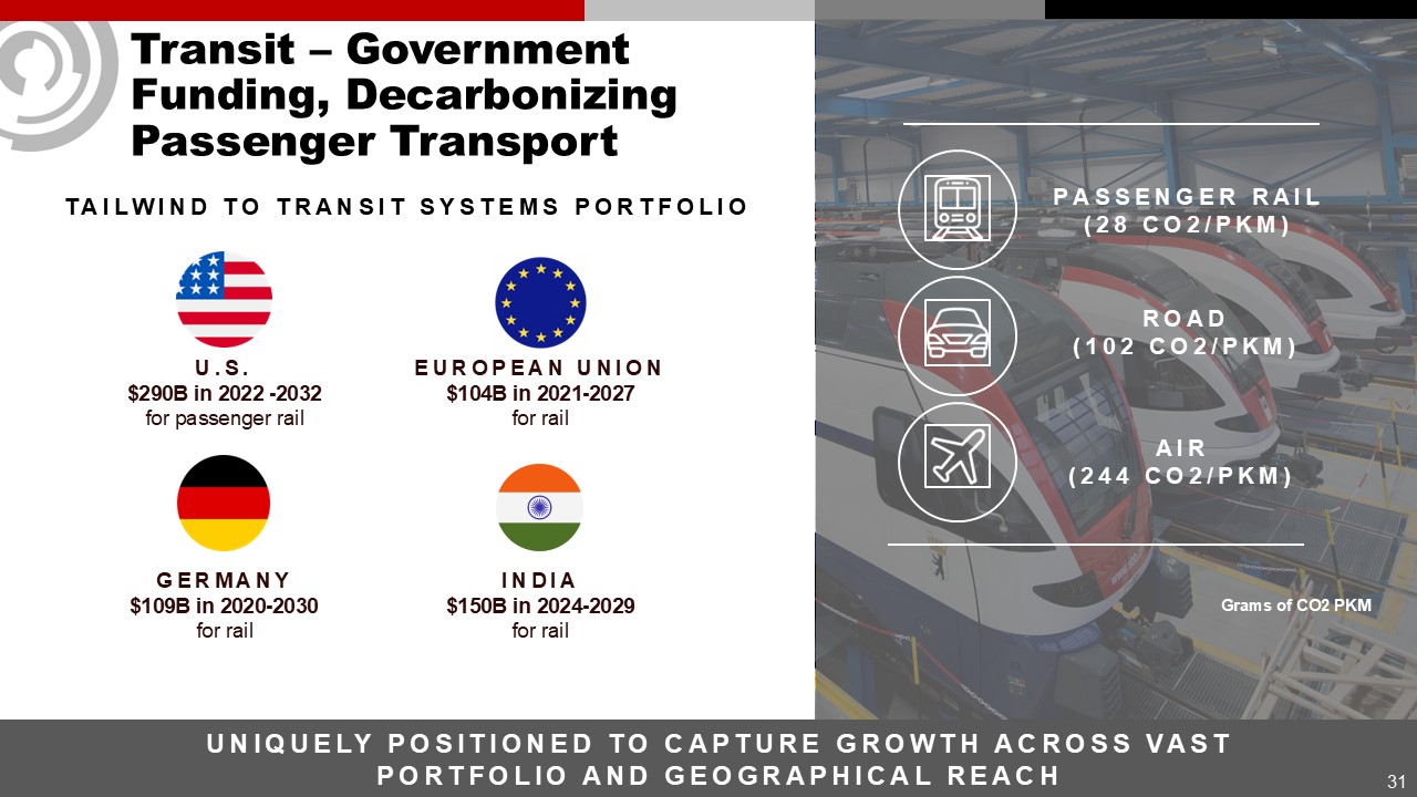 Transit – Government Funding, Decarbonizing Passenger Transport  UNIQUELY POSITIONED TO CAPTURE GROWTH ACROSS VAST PORTFOLIO AND GEOGRAPHICAL REACH  TAILWIND TO TRANSIT SYSTEMS PORTFOLIO  U.S.   $290B in 2022 -2032  for passenger rail  EUROPEAN UNION   $104B in 2021-2027  for rail  INDIA  $150B in 2024-2029  for rail  GERMANY  $109B in 2020-2030  for rail  PASSENGER RAIL  (28 CO2/PKM)  ROAD  (102 CO2/PKM)  AIR  (244 CO2/PKM)  Grams of CO2 PKM  31