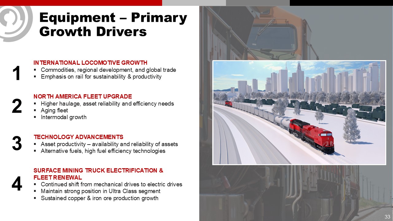 Equipment – Primary Growth Drivers  1  2  3  4  SURFACE MINING TRUCK ELECTRIFICATION & FLEET RENEWAL  Continued shift from mechanical drives to electric drives  Maintain strong position in Ultra Class segment  Sustained copper & iron ore production growth  NORTH AMERICA FLEET UPGRADE  Higher haulage, asset reliability and efficiency needs  Aging fleet  Intermodal growth  INTERNATIONAL LOCOMOTIVE GROWTH   Commodities, regional development, and global trade  Emphasis on rail for sustainability & productivity  TECHNOLOGY ADVANCEMENTS  Asset productivity – availability and reliability of assets  Alternative fuels, high fuel efficiency technologies  33