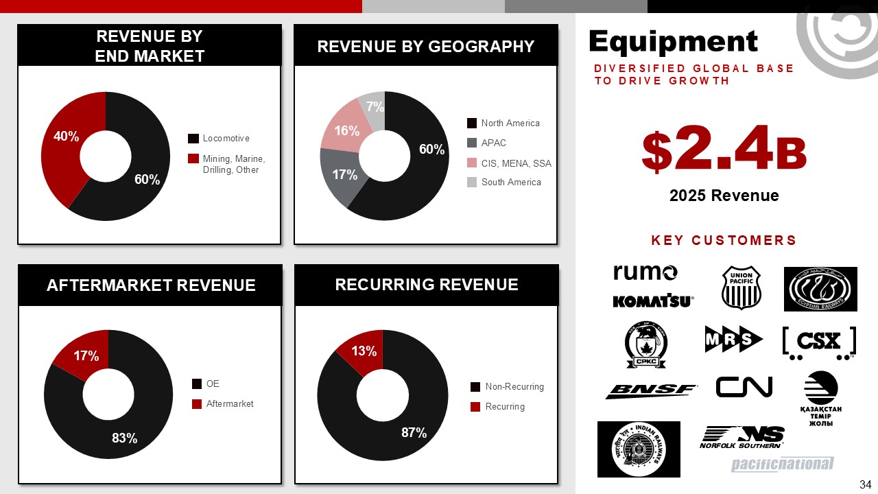 Equipment  REVENUE BY  END MARKET  REVENUE BY GEOGRAPHY  AFTERMARKET REVENUE  RECURRING REVENUE  60%  17%  87%  13%  17%  83%  OE  Aftermarket  Non-Recurring  Recurring  North America  APAC  CIS, MENA, SSA  South America  7%  16%  $2.4B  2025 Revenue  Key customers  DIVERSIFIED GLOBAL BASE TO DRIVE GROWTH  60%  Locomotive  Mining, Marine, Drilling, Other  40%  34