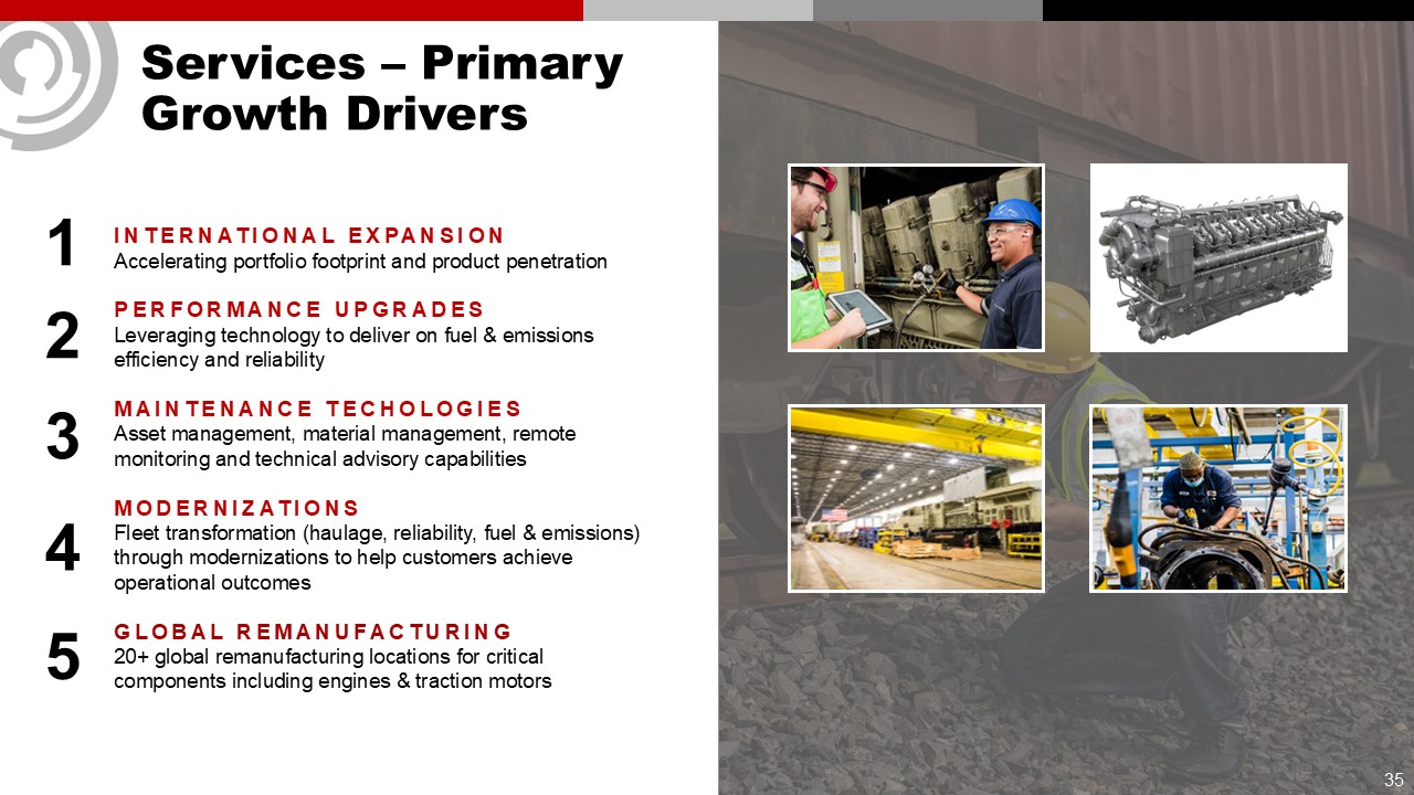 Services – Primary Growth Drivers  1  2  3  4  INTERNATIONAL EXPANSION  Accelerating portfolio footprint and product penetration  PERFORMANCE UPGRADESLeveraging technology to deliver on fuel & emissions efficiency and reliability  MAINTENANCE TECHOLOGIES  Asset management, material management, remote monitoring and technical advisory capabilities  MODERNIZATIONS Fleet transformation (haulage, reliability, fuel & emissions) through modernizations to help customers achieve operational outcomes  GLOBAL REMANUFACTURING  20+ global remanufacturing locations for critical components including engines & traction motors  5  35