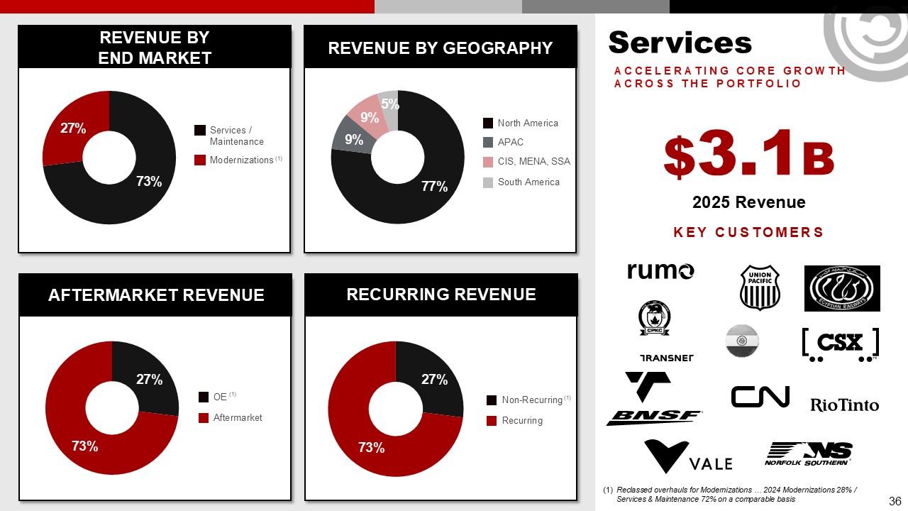 Services  REVENUE BY  END MARKET  REVENUE BY GEOGRAPHY  AFTERMARKET REVENUE  RECURRING REVENUE  77%  9%  73%  27%  27%  73%  OE  Aftermarket  Non-Recurring  Recurring  North America  APAC  CIS, MENA, SSA  South America  5%  9%  $3.1B  2025 Revenue  Key customers  ACCELERATING core GROWTH ACROSS THE PORTFOLIO  73%  Services /  Maintenance   Modernizations  27%  36  (1) Reclassed overhauls for Modernizations … 2024 Modernizations 28% / Services & Maintenance 72% on a comparable basis  (1)  (1)  (1)