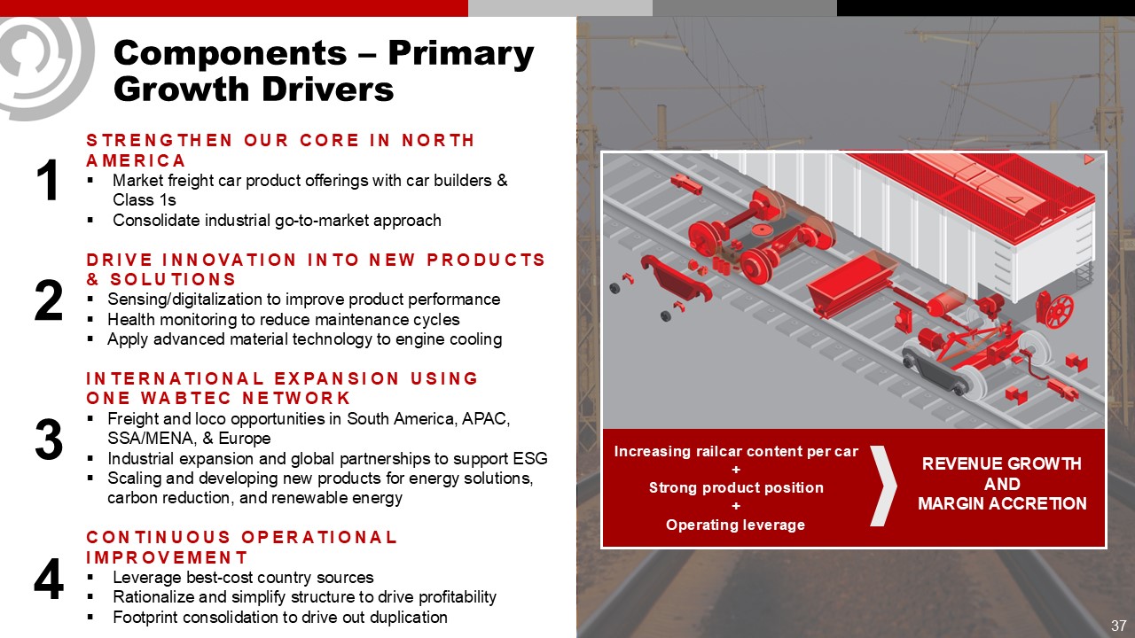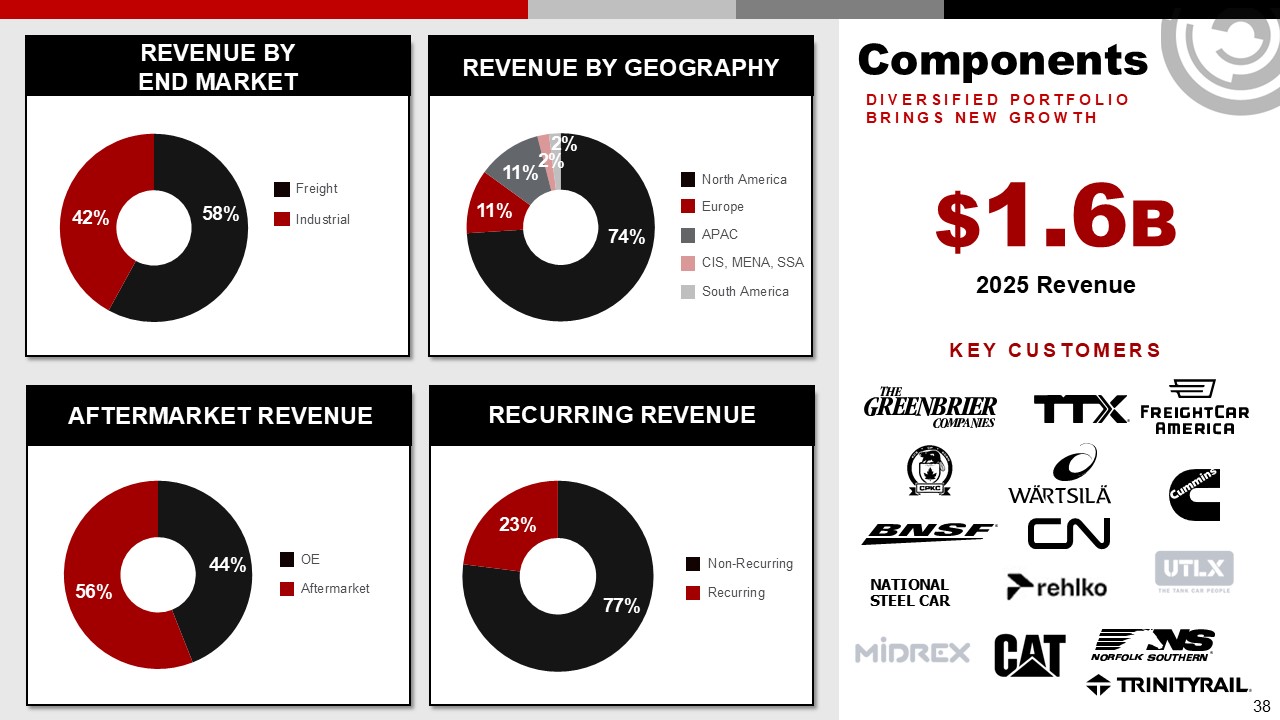 Components – Primary Growth Drivers  1  2  3  4  STRENGTHEN OUR CORE IN NORTH AMERICA  Market freight car product offerings with car builders & Class 1s  Consolidate industrial go-to-market approach  DRIVE INNOVATION INTO NEW PRODUCTS & SOLUTIONS  Sensing/digitalization to improve product performance  Health monitoring to reduce maintenance cycles  Apply advanced material technology to engine cooling  INTERNATIONAL EXPANSION USING ONE WABTEC NETWORK  Freight and loco opportunities in South America, APAC, SSA/MENA, & Europe  Industrial expansion and global partnerships to support ESG  Scaling and developing new products for energy solutions, carbon reduction, and renewable energy  CONTINUOUS OPERATIONAL IMPROVEMENT  Leverage best-cost country sources  Rationalize and simplify structure to drive profitability  Footprint consolidation to drive out duplication  Increasing railcar content per car  +   Strong product position   +   Operating leverage  REVENUE GROWTH   AND  MARGIN ACCRETION  37