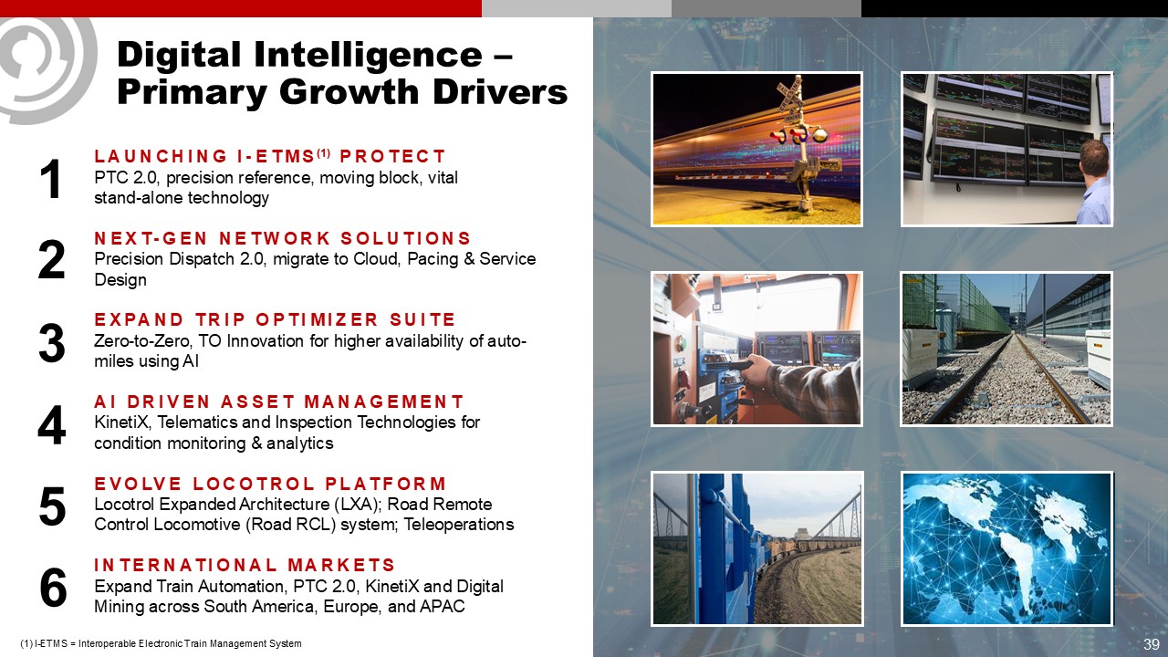 Digital Intelligence – Primary Growth Drivers  1  2  3  4  LAUNCHING I-ETMS(1) PROTECT  PTC 2.0, precision reference, moving block, vital stand-alone technology  NEXT-GEN NETWORK SOLUTIONSPrecision Dispatch 2.0, migrate to Cloud, Pacing & Service Design  EXPAND TRIP OPTIMIZER SUITE  Zero-to-Zero, TO Innovation for higher availability of auto-miles using AI  AI DRIVEN ASSET MANAGEMENT KinetiX, Telematics and Inspection Technologies for condition monitoring & analytics  EVOLVE LOCOTROL PLATFORM  Locotrol Expanded Architecture (LXA); Road Remote Control Locomotive (Road RCL) system; Teleoperations  INTERNATIONAL MARKETS  Expand Train Automation, PTC 2.0, KinetiX and Digital Mining across South America, Europe, and APAC  5  (1) I-ETMS = Interoperable Electronic Train Management System  6  39