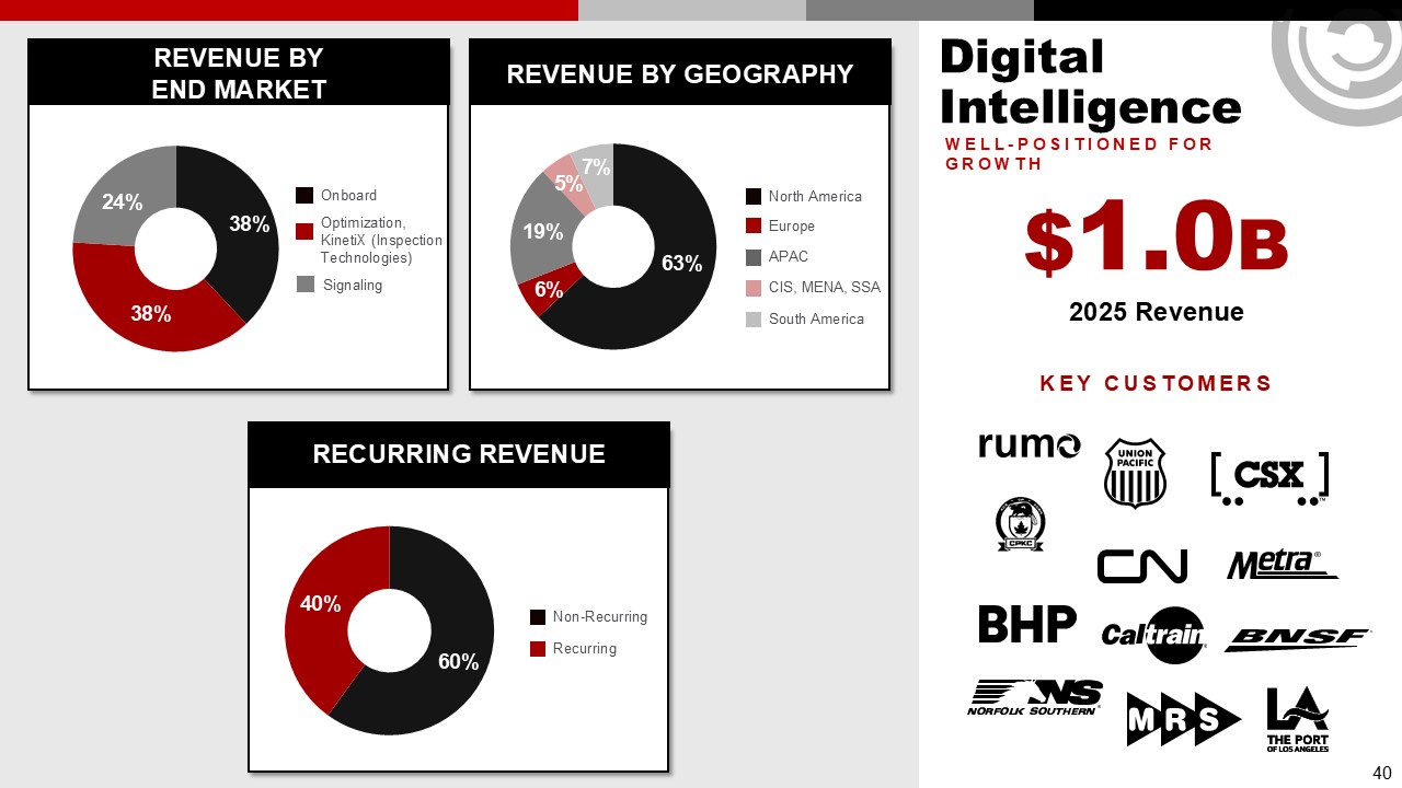 Digital Intelligence  REVENUE BY  END MARKET  REVENUE BY GEOGRAPHY  RECURRING REVENUE  60%  40%  Non-Recurring  Recurring  North America  Europe  APAC  CIS, MENA, SSA  South America  $1.0B  2025 Revenue  Key customers  WELL-POSITIONED FOR GROWTH  38%  24%  Onboard  Optimization, KinetiX (Inspection Technologies)  38%  Signaling  63%  19%  6%  5%  7%  40