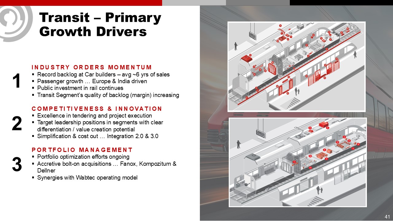 Transit – Primary Growth Drivers  1  2  3  INDUSTRY ORDERS MOMENTUM  Record backlog at Car builders – avg ~6 yrs of sales   Passenger growth … Europe & India driven  Public investment in rail continues  Transit Segment’s quality of backlog (margin) increasing  COMPETITIVENESS & INNOVATION  Excellence in tendering and project execution  Target leadership positions in segments with clear differentiation / value creation potential  Simplification & cost out … Integration 2.0 & 3.0  PORTFOLIO MANAGEMENT  Portfolio optimization efforts ongoing  Accretive bolt-on acquisitions … Fanox, Kompozitum & Dellner  Synergies with Wabtec operating model   41