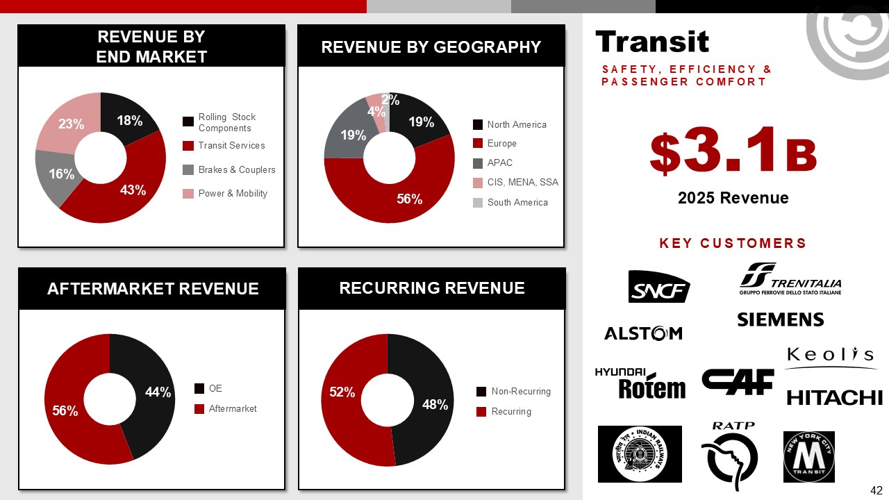 Transit  REVENUE BY  END MARKET  REVENUE BY GEOGRAPHY  AFTERMARKET REVENUE  RECURRING REVENUE  56%  18%  43%  19%  19%  48%  52%  44%  56%  OE  Aftermarket  Non-Recurring  Recurring  Rolling Stock Components  Transit Services  Brakes & Couplers  23%  Power & Mobility  16%  North America  Europe  APAC  CIS, MENA, SSA  South America  4%  2%  $3.1B  2025 Revenue  Key customers  SAFETY, EFFICIENCY & PASSENGER COMFORT  42