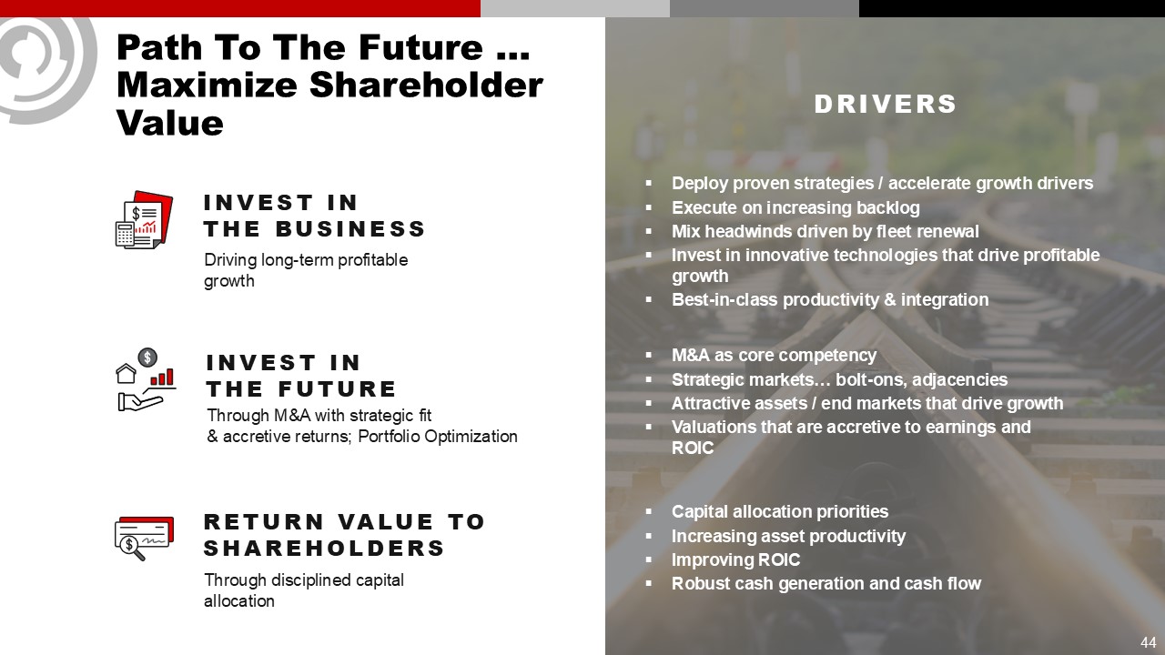 Path To The Future …Maximize Shareholder Value  INVEST INTHE BUSINESS  Driving long-term profitable growth   DRIVERS  INVEST IN THE FUTURE  Through M&A with strategic fit& accretive returns; Portfolio Optimization  RETURN VALUE TO SHAREHOLDERS  Through disciplined capital allocation  M&A as core competency  Strategic markets… bolt-ons, adjacencies  Attractive assets / end markets that drive growth  Valuations that are accretive to earnings and ROIC  Capital allocation priorities  Increasing asset productivity  Improving ROIC  Robust cash generation and cash flow   Deploy proven strategies / accelerate growth drivers  Execute on increasing backlog  Mix headwinds driven by fleet renewal  Invest in innovative technologies that drive profitable growth  Best-in-class productivity & integration  44