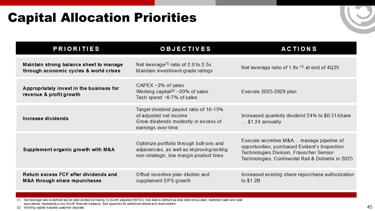 Capital Allocation Priorities  PRIORITIES  OBJECTIVES  ACTIONS  Maintain strong balance sheet to manage through economic cycles & world crises  Net leverage(1) ratio of 2.0 to 2.5x. Maintain investment-grade ratings  Net leverage ratio of 1.9x (1) at end of 4Q25  Appropriately invest in the business for revenue & profit growth  CAPEX ~2% of sales  Working capital(2) ~20% of sales  Tech spend ~6-7% of sales  Execute 2025-2029 plan  Increase dividends  Target dividend payout ratio of 10-15%  of adjusted net income  Grow dividends modestly in excess of earnings over time  Increased quarterly dividend 24% to $0.31/share … $1.24 annually  Supplement organic growth with M&A  Optimize portfolio through bolt-ons and adjacencies, as well as improving/exiting non-strategic, low margin product lines   Execute accretive M&A… manage pipeline of opportunities; purchased Evident’s Inspection Technologies Division, Frauscher Sensor Technologies, Continental Rail & Dotnetix in 2025  Return excess FCF after dividends and M&A through share repurchases  Offset incentive plan dilution and supplement EPS growth  Increased existing share repurchase authorization to $1.2B  Net leverage ratio is defined as net debt divided by trailing 12-month adjusted EBITDA. Net debt is defined as total debt minus cash, restricted cash and cash equivalents; represents a non-GAAP financial measure. See Appendix for additional details and reconciliation  Working capital includes customer deposits  45