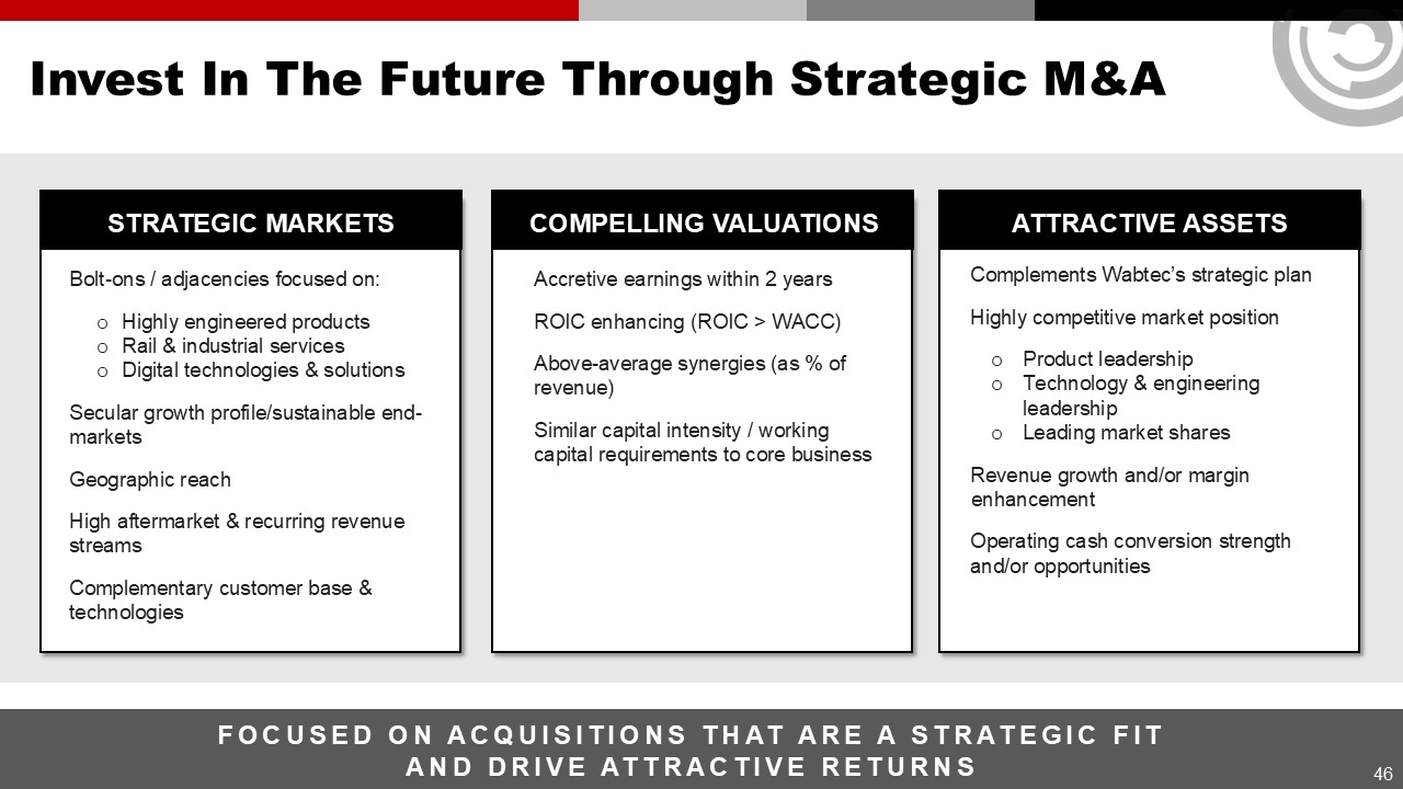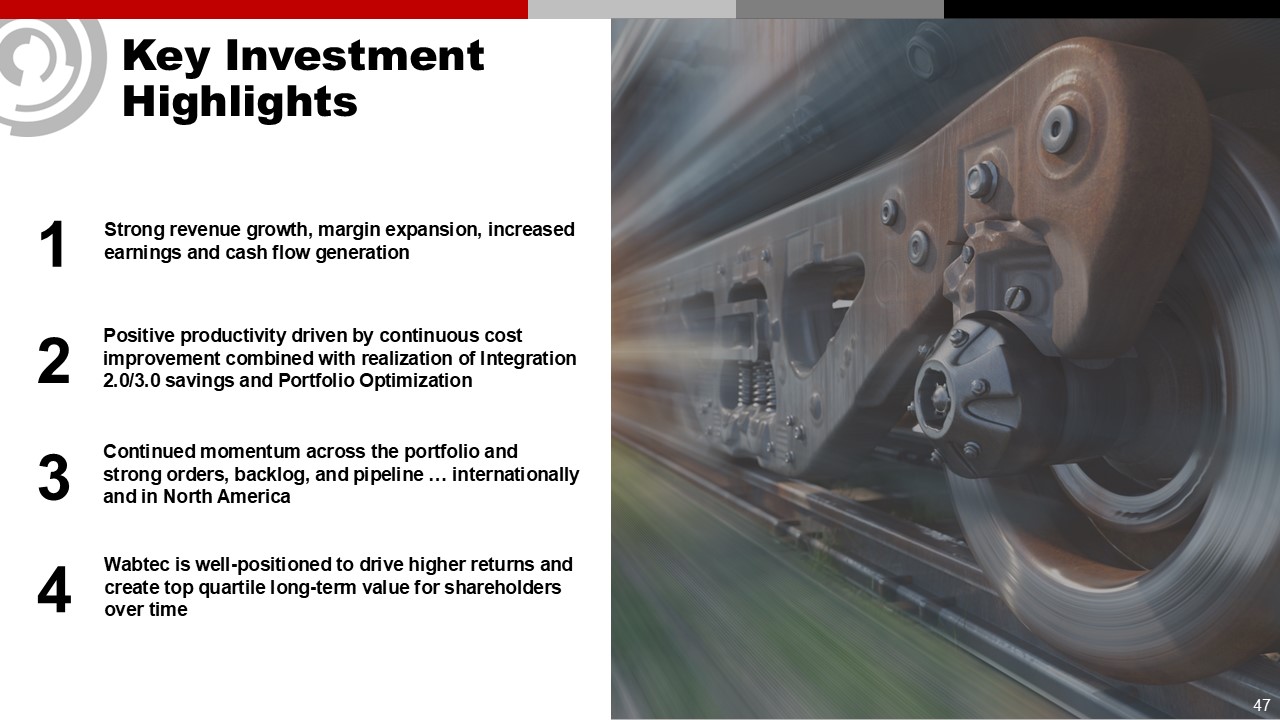 Invest In The Future Through Strategic M&A  46  FOCUSED ON ACQUISITIONS THAT ARE A STRATEGIC FIT AND DRIVE ATTRACTIVE RETURNS  STRATEGIC MARKETS  COMPELLING VALUATIONS  ATTRACTIVE ASSETS  Accretive earnings within 2 years  ROIC enhancing (ROIC > WACC)  Above-average synergies (as % of revenue)  Similar capital intensity / workingcapital requirements to core business  Complements Wabtec’s strategic plan  Highly competitive market position  Product leadership  Technology & engineering leadership  Leading market shares  Revenue growth and/or margin enhancement  Operating cash conversion strength and/or opportunities  Bolt-ons / adjacencies focused on:  Highly engineered products  Rail & industrial services  Digital technologies & solutions  Secular growth profile/sustainable end-markets  Geographic reach  High aftermarket & recurring revenue streams  Complementary customer base & technologies