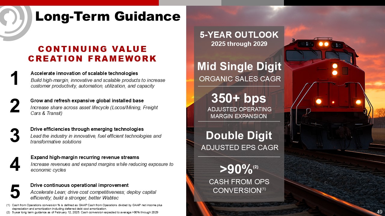 49  Long-Term Guidance  Drive efficiencies through emerging technologies  Lead the industry in innovative, fuel efficient technologies and transformative solutions  Grow and refresh expansive global installed base  Increase share across asset lifecycle (Locos/Mining, Freight Cars & Transit)  Expand high-margin recurring revenue streams  Increase revenues and expand margins while reducing exposure to economic cycles  Accelerate innovation of scalable technologies  Build high-margin, innovative and scalable products to increase customer productivity, automation, utilization, and capacity  Drive continuous operational improvement  Accelerate Lean; drive cost competitiveness; deploy capital efficiently; build a stronger, better Wabtec  1  2  3  4  5  CONTINUING Value Creation Framework  5-YEAR OUTLOOK  2025 through 2029  Mid Single Digit  ORGANIC SALES CAGR  Double Digit   ADJUSTED EPS CAGR  >90%(2)  CASH FROM OPS  CONVERSION(1)  350+ bps   ADJUSTED OPERATING MARGIN EXPANSION  Cash from Operations conversion % is defined as GAAP Cash from Operations divided by GAAP net income plus depreciation and amortization including deferred debt cost amortization.   5-year long term guidance as of February 12, 2025. Cash conversion expected to average >90% through 2029