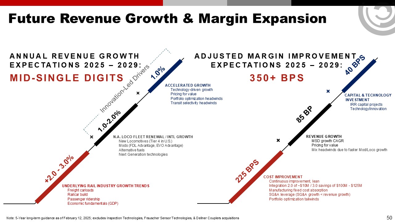 ADJUSTED MARGIN IMPROVEMENT   EXPECTATIONS 2025 – 2029:  350+ BPS  Future Revenue Growth & Margin Expansion  +2.0 - 3.0% +  1.0%  1.0-2.0% +  Innovation-Led Drivers  225 BPS + 85 BP + 40 BPS  ANNUAL REVENUE GROWTH  EXPECTATIONS 2025 – 2029:  MID-SINGLE DIGITS  ACCELERATED GROWTH  Technology-driven growth  Pricing for value  Portfolio optimization headwinds  Transit selectivity headwinds  N.A. LOCO FLEET RENEWAL / INTL GROWTH  New Locomotives (Tier 4 in U.S.)  Mods (FDL Advantage, EVO Advantage)  Alternative fuels   Next Generation technologies  UNDERLYING RAIL INDUSTRY GROWTH TRENDS  Freight carloads   Railcar build   Passenger ridership  Economic fundamentals (GDP)  CAPITAL & TECHNOLOGY   INVESTMENT  IRR capital projects   Technology/Innovation  REVENUE GROWTH   MSD growth CAGR   Pricing for value   Mix headwinds due to faster Mod/Loco growth  COST IMPROVEMENT   Continuous improvement, lean   Integration 2.0 of ~$10M / 3.0 savings of $100M - $125M   Manufacturing fixed cost absorption   SG&A leverage (SG&A growth < revenue growth)   Portfolio optimization tailwinds  Note: 5-Year long-term guidance as of February 12, 2025; excludes Inspection Technologies, Frauscher Sensor Technologies, & Dellner Couplers acquisitions  50