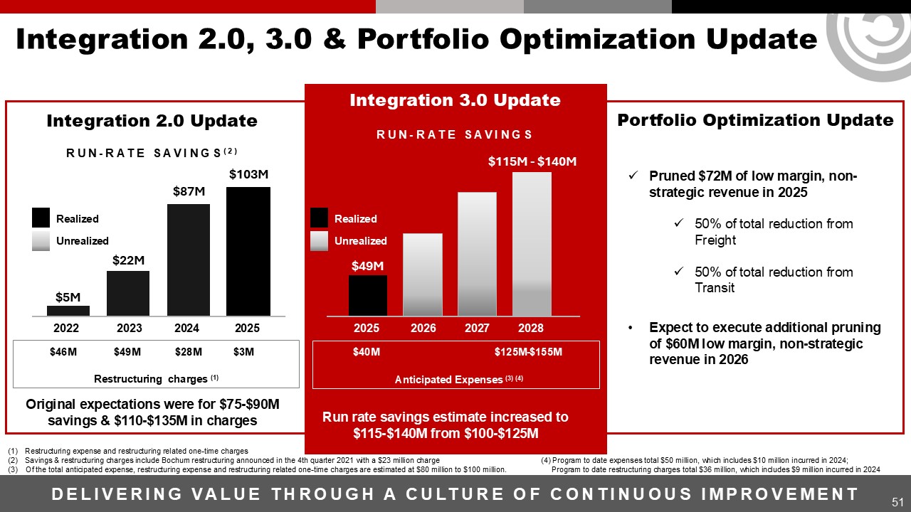 51  Integration 2.0, 3.0 & Portfolio Optimization Update  Integration 2.0 Update  Integration 3.0 Update  $5M  RUN-RATE SAVINGS(2)   Unrealized   Restructuring charges (1)   $46M  $3M   $22M  $49M  $87M  $28M  $103M   Realized   Original expectations were for $75-$90M savings & $110-$135M in charges  Restructuring expense and restructuring related one-time charges  Savings & restructuring charges include Bochum restructuring announced in the 4th quarter 2021 with a $23 million charge   (3) Of the total anticipated expense, restructuring expense and restructuring related one-time charges are estimated at $80 million to $100 million.   2022 2023 2024 2025  $49M  RUN-RATE SAVINGS   Unrealized   Anticipated Expenses (3) (4)   $40M   $125M-$155M  $115M - $140M   Realized   Run rate savings estimate increased to $115-$140M from $100-$125M   2025 2026 2027 2028  Portfolio Optimization Update  Pruned $72M of low margin, non-strategic revenue in 2025  50% of total reduction from Freight  50% of total reduction from Transit   Expect to execute additional pruning of $60M low margin, non-strategic revenue in 2026  Delivering value through a Culture of continuous improvement     (4) Program to date expenses total $50 million, which includes $10 million incurred in 2024;   Program to date restructuring charges total $36 million, which includes $9 million incurred in 2024