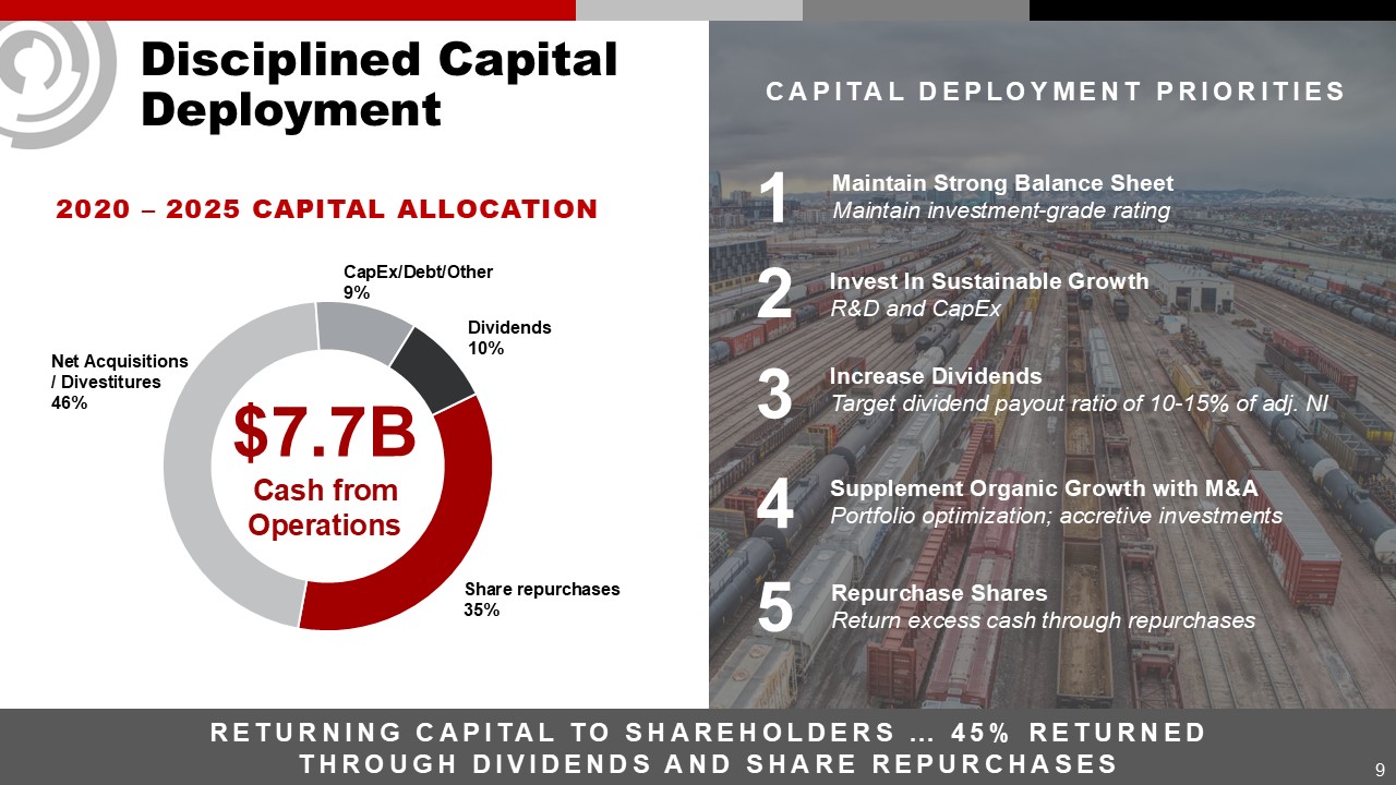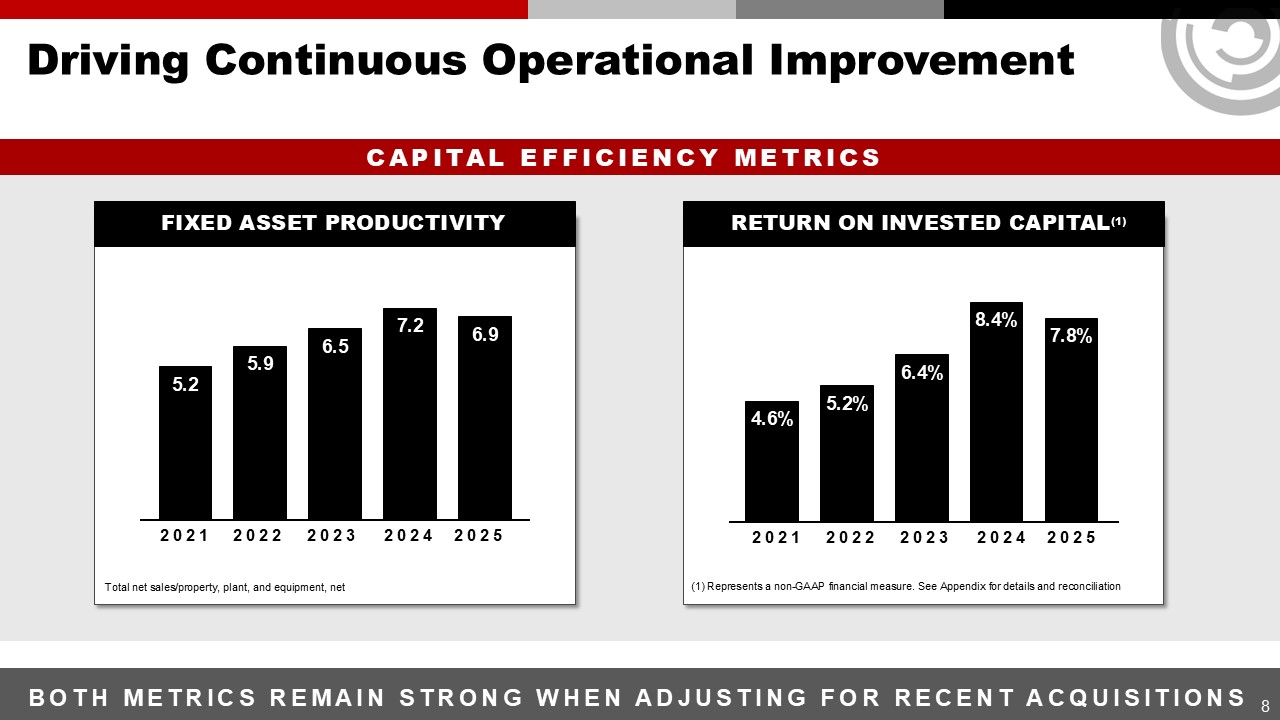 Driving Continuous Operational Improvement  2021  2023  FIXED ASSET PRODUCTIVITY  2024  2025  Total net sales/property, plant, and equipment, net  8  RETURN ON INVESTED CAPITAL(1)  (1) Represents a non-GAAP financial measure. See Appendix for details and reconciliation  CAPITAL EFFICIENCY METRICS  2022  2021  2023  2024  2025  2022  Both Metrics remain strong when adjusting for Recent Acquisitions