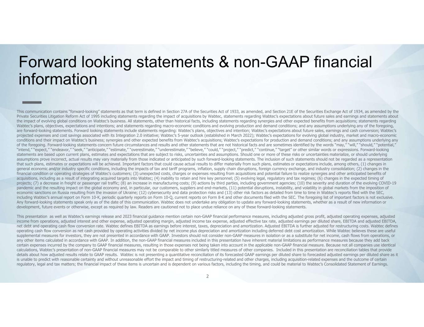 2 Forward looking statements & non-GAAP financial information This communication contains “forward-looking” statements as that term is defined in Section 27A of the Securities Act of 1933, as amended, and Section 21E of the Securities Exchange Act of 1934, as amended by the Private Securities Litigation Reform Act of 1995 including statements regarding the impact of acquisitions by Wabtec, statements regarding Wabtec’s expectations about future sales and earnings and statements about the impact of evolving global conditions on Wabtec’s business. All statements, other than historical facts, including statements regarding synergies and other expected benefits from acquisitions; statements regarding Wabtec’s plans, objectives, expectations and intentions; and statements regarding macro-economic conditions and evolving production and demand conditions; and any assumptions underlying any of the foregoing, are forward-looking statements. Forward looking statements include statements regarding: Wabtec’s plans, objectives and intention; Wabtec’s expectations about future sales, earnings and cash conversion; Wabtec’s projected expenses and cost savings associated with its Integration 2.0 initiative; Wabtec’s 5-year outlook (established in March 2022); Wabtec’s expectations for evolving global industry, market and macro-economic conditions and their impact on Wabtec’s business; synergies and other expected benefits from Wabtec’s acquisitions; Wabtec’s expectations for production and demand conditions; and any assumptions underlying any of the foregoing. Forward-looking statements concern future circumstances and results and other statements that are not historical facts and are sometimes identified by the words “may,” “will,” “should,” “potential,” “intend,” “expect,” “endeavor,” “seek,” “anticipate,” “estimate,” “overestimate,” “underestimate,” “believe,” “could,” “project,” “predict,” “continue,” “target” or other similar words or expressions. Forward-looking statements are based upon current plans, estimates and expectations that are subject to risks, uncertainties and assumptions. Should one or more of these risks or uncertainties materialize, or should underlying assumptions prove incorrect, actual results may vary materially from those indicated or anticipated by such forward-looking statements. The inclusion of such statements should not be regarded as a representation that such plans, estimates or expectations will be achieved. Important factors that could cause actual results to differ materially from such plans, estimates or expectations include, among others, (1) changes in general economic and/or industry specific conditions, including the impacts of tax and tariff programs, inflation, supply chain disruptions, foreign currency exchange, and industry consolidation; (2) changes in the financial condition or operating strategies of Wabtec's customers; (3) unexpected costs, charges or expenses resulting from acquisitions and potential failure to realize synergies and other anticipated benefits of acquisitions, including as a result of integrating acquired targets into Wabtec; (4) inability to retain and hire key personnel; (5) evolving legal, regulatory and tax regimes; (6) changes in the expected timing of projects; (7) a decrease in freight or passenger rail traffic; (8) an increase in manufacturing costs; (9) actions by third parties, including government agencies; (10) the severity and duration of the evolving COVID-19 pandemic and the resulting impact on the global economy and, in particular, our customers, suppliers and end-markets, (11) potential disruptions, instability, and volatility in global markets from the imposition of economic sanctions on Russia resulting from the invasion of Ukraine; (12) cybersecurity and data protection risks and (13) other risk factors as detailed from time to time in Wabtec’s reports filed with the SEC, including Wabtec’s annual report on Form 10-K, periodic quarterly reports on Form 10-Q, current reports on Form 8-K and other documents filed with the SEC. The foregoing list of important factors is not exclusive. Any forward-looking statements speak only as of the date of this communication. Wabtec does not undertake any obligation to update any forward-looking statements, whether as a result of new information or development, future events or otherwise, except as required by law. Readers are cautioned not to place undue reliance on any of these forward-looking statements. This presentation as well as Wabtec’s earnings release and 2023 financial guidance mention certain non-GAAP financial performance measures, including adjusted gross profit, adjusted operating expenses, adjusted income from operations, adjusted interest and other expense, adjusted operating margin, adjusted income tax expense, adjusted effective tax rate, adjusted earnings per diluted share, EBITDA and adjusted EBITDA, net debt and operating cash flow conversion rate. Wabtec defines EBITDA as earnings before interest, taxes, depreciation and amortization. Adjusted EBITDA is further adjusted for restructuring costs. Wabtec defines operating cash flow conversion as net cash provided by operating activities divided by net income plus depreciation and amortization including deferred debt cost amortization. While Wabtec believes these are useful supplemental measures for investors, they are not presented in accordance with GAAP. Investors should not consider non-GAAP measures in isolation or as a substitute for net income, cash flows from operations, or any other items calculated in accordance with GAAP. In addition, the non-GAAP financial measures included in this presentation have inherent material limitations as performance measures because they add back certain expenses incurred by the company to GAAP financial measures, resulting in those expenses not being taken into account in t