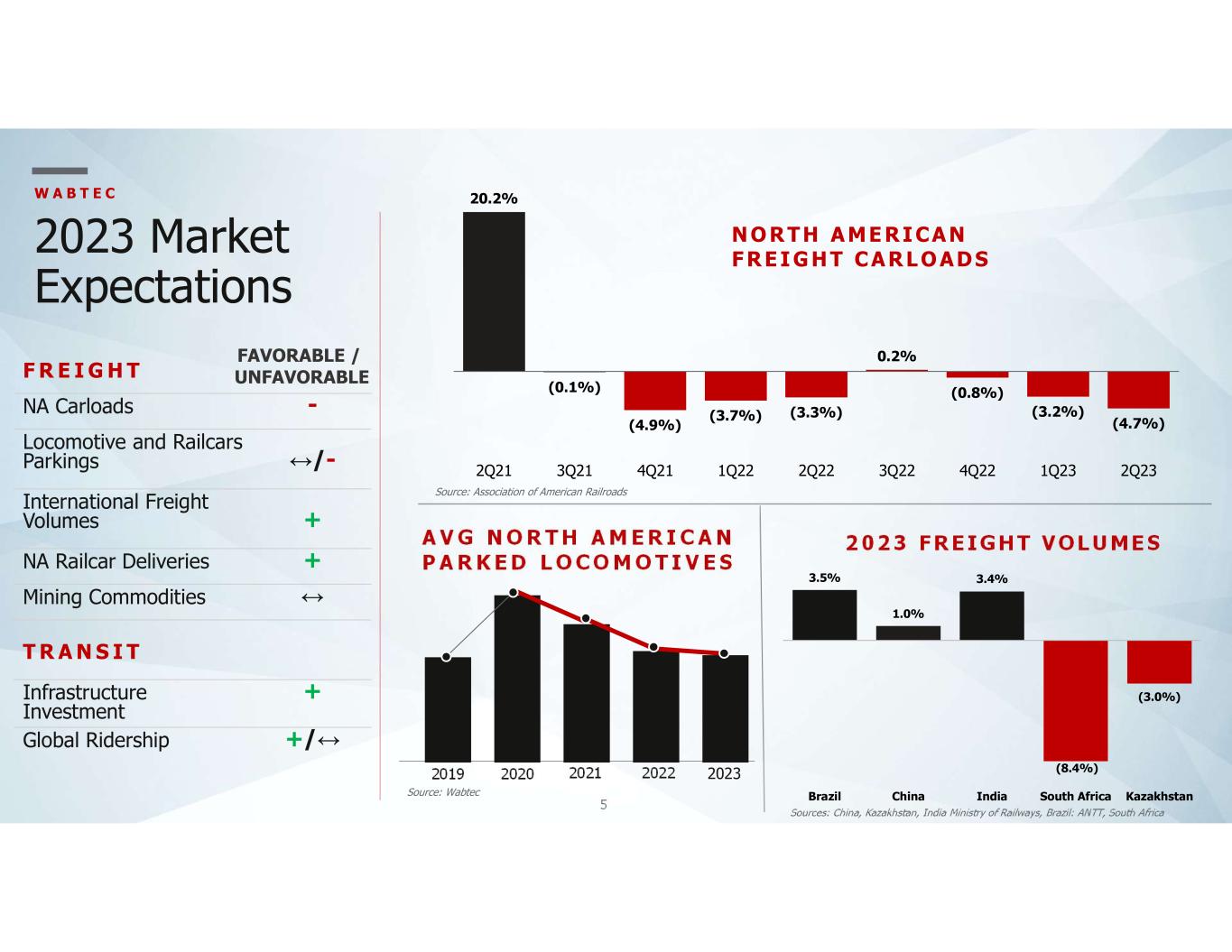 4 2Q 2023 overview Increased sales were driven by strong growth across the Freight and Transit segments Operating margin benefited from higher sales growth and lower SG&A as a percentage of sales, offset by mix GAAP EPS up 16.5% YoY … Adjusted EPS up 14.6% YoY from higher Freight and Transit sales Operating cash flow driven by higher net income … tempered by higher working capital to support strong sales growth across the portfolio Backlog provides improved multi-year visibility … 12-month backlog up 10.0% to $7.2 billion W A B T E C S A L ES O PERAT IN G MARG IN EARN I N GS PER S HARE CAS H F L O W FR OM O PERAT IO N S (1) M UL TI -Y EAR BA CK LO G $2.41B 16.4% $1.06 $115M $22.43B S T R O N G U N D ER L Y I N G M O M ENT U M AC R O S S T HE B U S I N ES S (1) Year-over-year 2nd quarter cash flow impact from securitization of accounts receivable was unfavorable $15 million (2) Adjusted numbers represent non-GAAP financial measures. See Appendix for additional details and reconciliations 2Q 2023 HIGHLIGHTS Up 17.5% YoY 12.9% GAAP Adjusted(2) $1.41 GAAP Adjusted(2)
