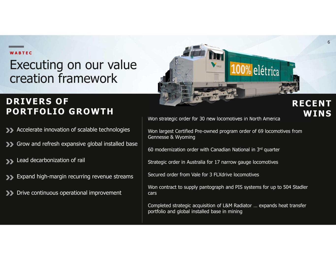 5 20.2% (0.1%) (4.9%) (3.7%) (3.3%) 0.2% (0.8%) (3.2%) (4.7%) 2Q21 3Q21 4Q21 1Q22 2Q22 3Q22 4Q22 1Q23 2Q23 F R E I G H T NA Carloads - Locomotive and Railcars Parkings ↔/- International Freight Volumes + NA Railcar Deliveries + Mining Commodities ↔ T R A N S I T Infrastructure Investment + Global Ridership +/↔ W A B T E C 2023 Market Expectations N O RTH AME RI CAN F REI GHT CARL O ADS 202 3 F RE IGHT VO L UM ESA V G N O R T H A M E R I C A N P A R K E D L O C O M O T I V E S 2019 2020 2021 2022 Sources: China, Kazakhstan, India Ministry of Railways, Brazil: ANTT, South Africa 3.5% 1.0% 3.4% (8.4%) (3.0%) Brazil China India South Africa Kazakhstan 2023 Source: Association of American Railroads Source: Wabtec FAVORABLE / UNFAVORABLE