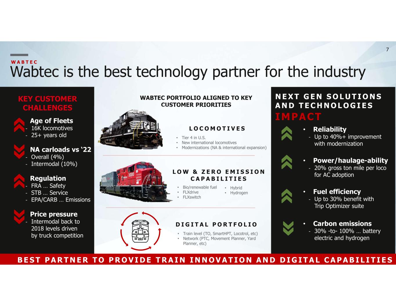 6 DRIVERS OF PORTFOLIO GROWTH RECENT WINS Won strategic order for 30 new locomotives in North America Won largest Certified Pre-owned program order of 69 locomotives from Gennesse & Wyoming 60 modernization order with Canadian National in 3rd quarter Strategic order in Australia for 17 narrow gauge locomotives Secured order from Vale for 3 FLXdrive locomotives Won contract to supply pantograph and PIS systems for up to 504 Stadler cars Completed strategic acquisition of L&M Radiator … expands heat transfer portfolio and global installed base in mining W A B T E C Executing on our value creation framework Accelerate innovation of scalable technologies Grow and refresh expansive global installed base Lead decarbonization of rail Expand high-margin recurring revenue streams Drive continuous operational improvement 6