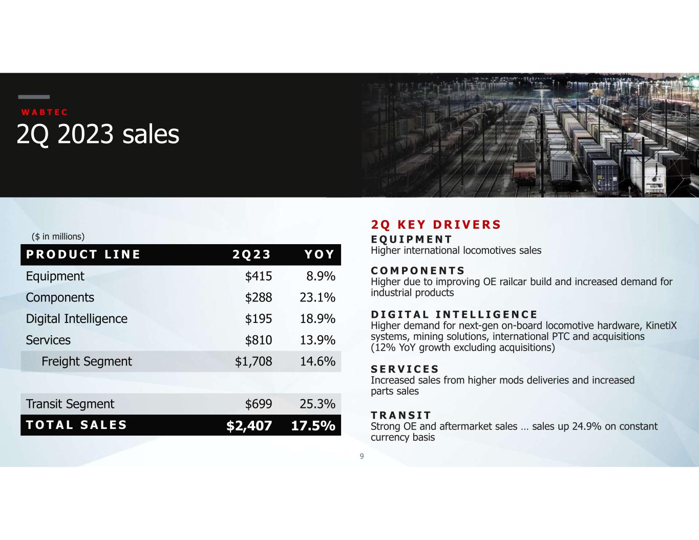 8 STRONG SALES AND EPS GROWTH DESPITE MACRO UNCERTAINTY (1) Adjusted numbers represent non-GAAP financial measures. See Appendix for additional details and reconciliations 2Q 2023 financial summary W A B T E C OP INCOME/OP MARGIN 17.5% INCREASE $264M 12.9% 2022 GAAP SALES EPS $2.05B 2022 $2.41B 2023 $312M 12.9% 2023 GAAP $340M 16.7% 2022 ADJ(1) $395M 16.4% 2023 ADJ(1) $0.91 2022 GAAP $1.06 2023 GAAP $1.23 2022 ADJ(1) $1.41 2023 ADJ(1) (17.9% INCREASE EX-CURRENCY) +14.6% YoY +16.5% YoY