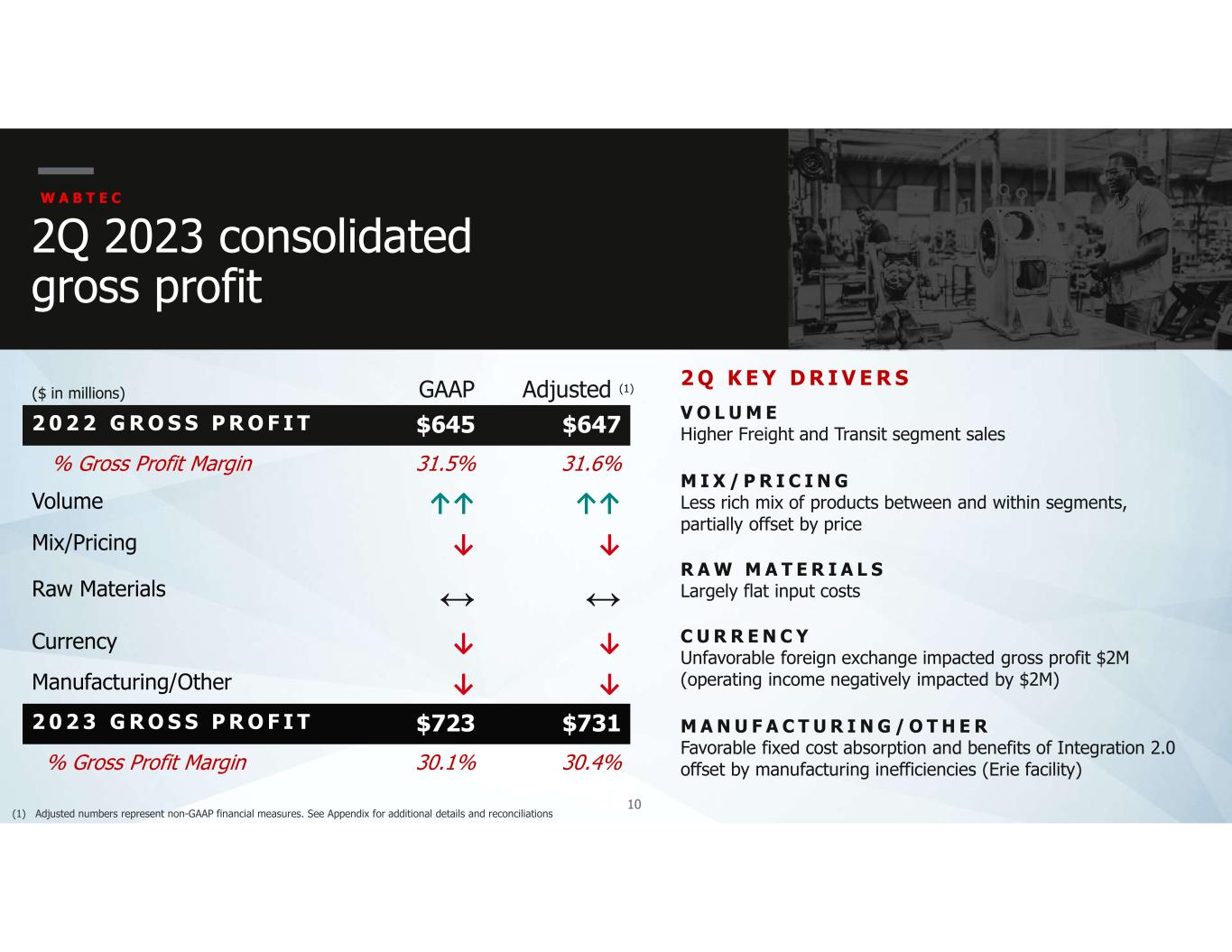9 W A B T E C 2Q 2023 sales P R O D U C T L I N E 2 Q 2 3 Y O Y Equipment $415 8.9% Components $288 23.1% Digital Intelligence $195 18.9% Services $810 13.9% Freight Segment $1,708 14.6% Transit Segment $699 25.3% T O T A L S A L E S $2,407 17.5% E Q U I P M E N T Higher international locomotives sales C O M P O N E N T S Higher due to improving OE railcar build and increased demand for industrial products D I G I T A L I N T E L L I G E N C E Higher demand for next-gen on-board locomotive hardware, KinetiX systems, mining solutions, international PTC and acquisitions (12% YoY growth excluding acquisitions) S E R V I C E S Increased sales from higher mods deliveries and increased parts sales T R A N S I T Strong OE and aftermarket sales … sales up 24.9% on constant currency basis 2 Q K E Y D R I V E R S ($ in millions)