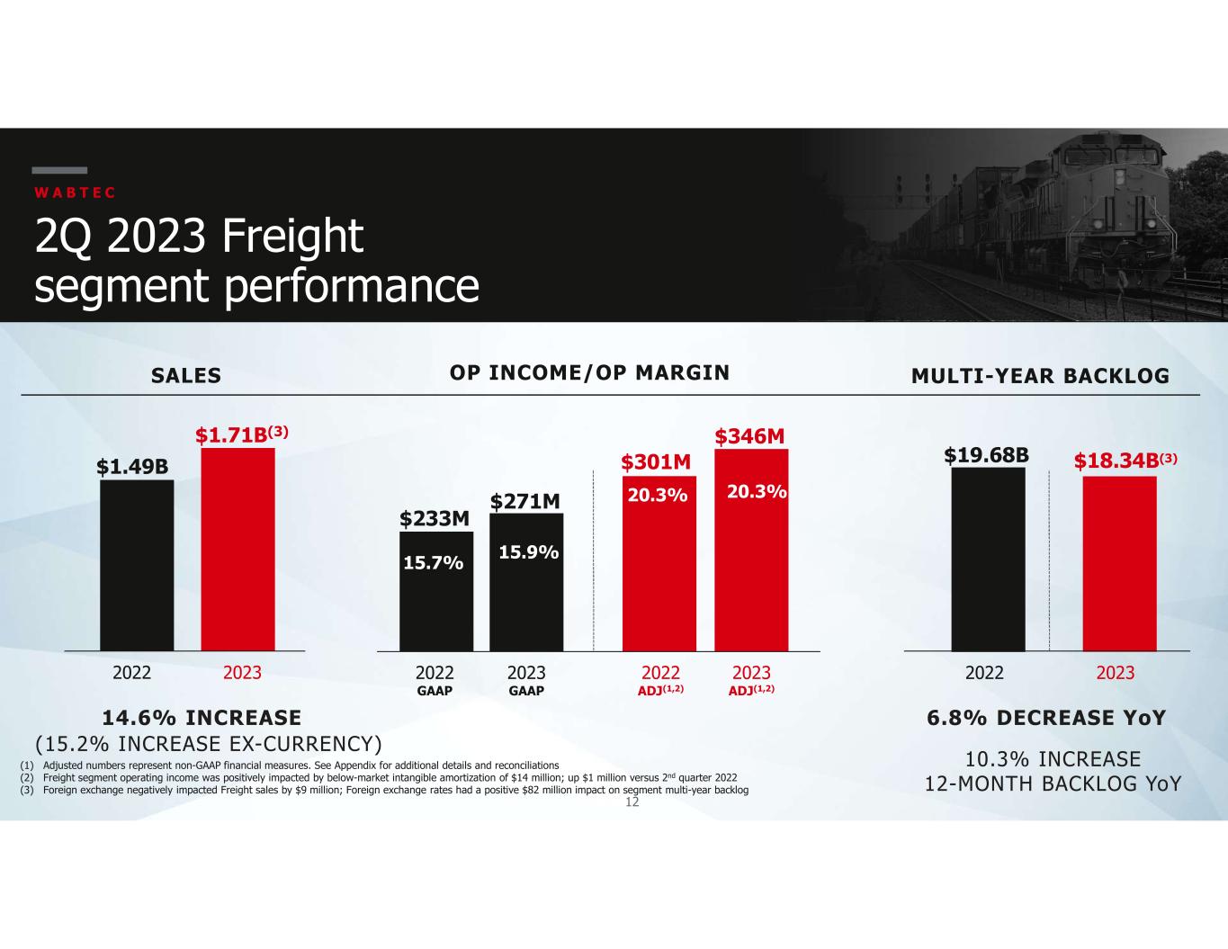 11 2 0 2 2 O P I N C O M E $264 $340 % Operating Margin 12.9% 16.7% Gross Profit 78 84 SG&A (26) (26) Engineering (3) (3) Amortization (1) - 2 0 2 3 O P I N C O M E $312 $395 % Operating Margin 12.9% 16.4% W A B T E C 2Q 2023 consolidated operating income (1) Adjusted numbers represent non-GAAP financial measures. See Appendix for additional details and reconciliations O P M A R G I N B E N E F I T E D F R O M H I G H E R S A L E S A N D L O W E R S G & A A S P E R C E N T A G E O F S A L E S Adjusted (1)($ in millions) GAAP