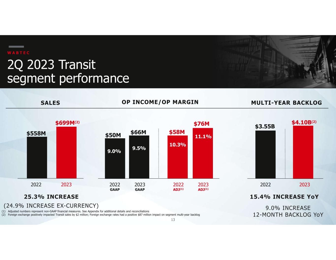 12 (1) Adjusted numbers represent non-GAAP financial measures. See Appendix for additional details and reconciliations (2) Freight segment operating income was positively impacted by below-market intangible amortization of $14 million; up $1 million versus 2nd quarter 2022 (3) Foreign exchange negatively impacted Freight sales by $9 million; Foreign exchange rates had a positive $82 million impact on segment multi-year backlog 2Q 2023 Freight segment performance W A B T E C 14.6% INCREASE OP INCOME/OP MARGIN $233M 15.7% 2022 GAAP SALES MULTI-YEAR BACKLOG 6.8% DECREASE YoY $1.49B 2022 $1.71B(3) 2023 $271M 15.9% 2023 GAAP $301M 20.3% 2022 ADJ(1,2) $346M 20.3% 2023 ADJ(1,2) $19.68B 2022 $18.34B(3) 2023 10.3% INCREASE 12-MONTH BACKLOG YoY (15.2% INCREASE EX-CURRENCY)