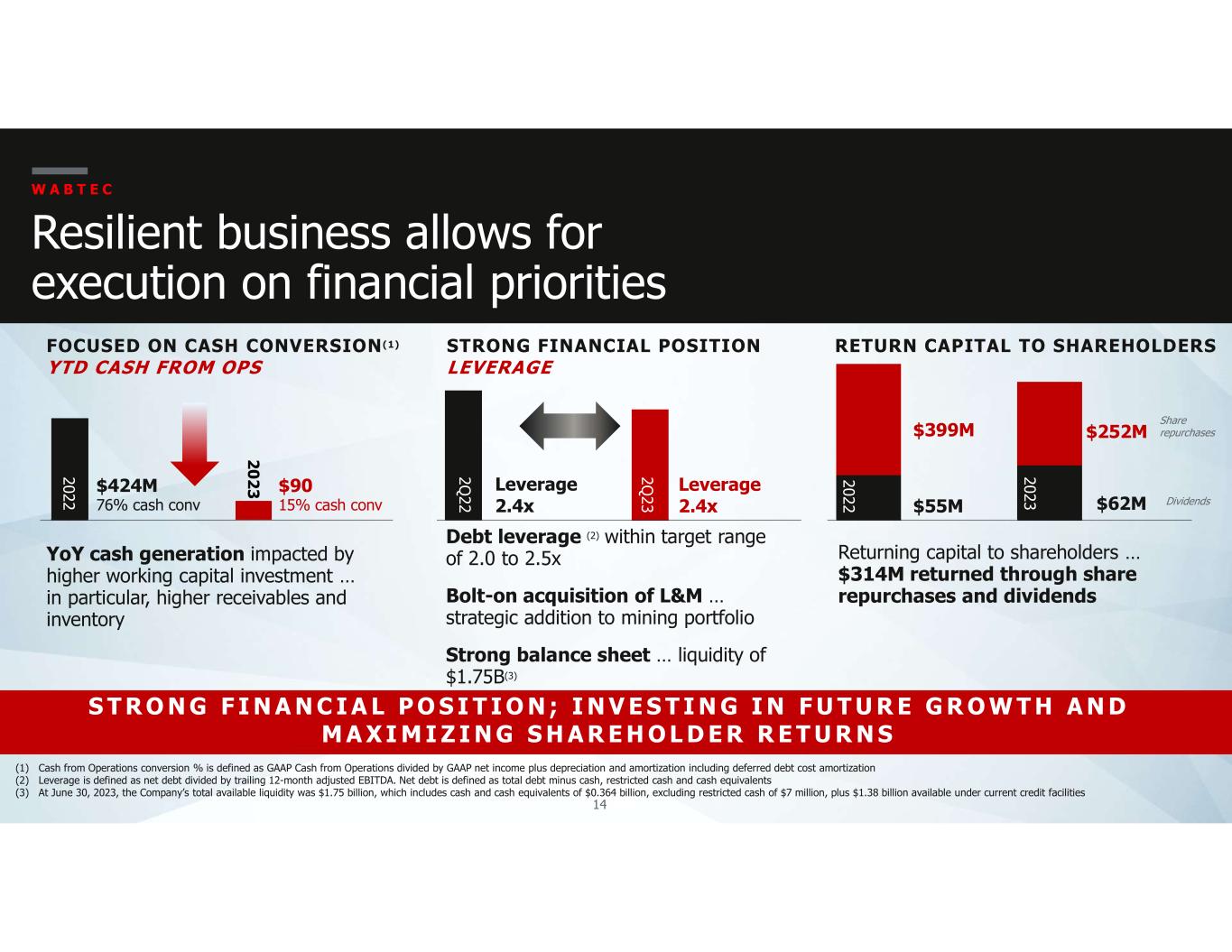 13 (1) Adjusted numbers represent non-GAAP financial measures. See Appendix for additional details and reconciliations (2) Foreign exchange positively impacted Transit sales by $2 million; Foreign exchange rates had a positive $87 million impact on segment multi-year backlog 2Q 2023 Transit segment performance W A B T E C OP INCOME/OP MARGIN 25.3% INCREASE $50M 9.0% 2022 GAAP SALES MULTI-YEAR BACKLOG 15.4% INCREASE YoY $558M 2022 $699M(2) 2023 $66M 9.5% 2023 GAAP $58M 10.3% 2022 ADJ(1) $76M 11.1% 2023 ADJ(1) $3.55B 2022 $4.10B(2) 2023 (24.9% INCREASE EX-CURRENCY) 9.0% INCREASE 12-MONTH BACKLOG YoY