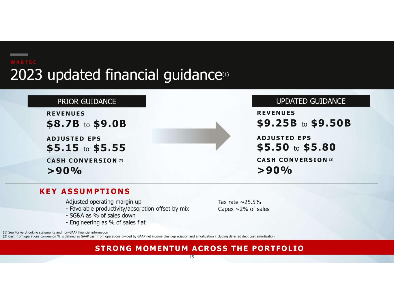 14 W A B T E C Resilient business allows for execution on financial priorities STRONG FINANCIAL POSITION LEVERAGE FOCUSED ON CASH CONVERSION(1) YTD CASH FROM OPS RETURN CAPITAL TO SHAREHOLDERS YoY cash generation impacted by higher working capital investment … in particular, higher receivables and inventory Debt leverage (2) within target range of 2.0 to 2.5x Bolt-on acquisition of L&M … strategic addition to mining portfolio Strong balance sheet … liquidity of $1.75B(3) Returning capital to shareholders … $314M returned through share repurchases and dividends S T R O N G F I N A N C I A L P O S I T I O N ; I N V E S T I N G I N F U T U R E G R O W T H A N D M A X I M I Z I N G S H A R E H O L D E R R E T U R N S (1) Cash from Operations conversion % is defined as GAAP Cash from Operations divided by GAAP net income plus depreciation and amortization including deferred debt cost amortization (2) Leverage is defined as net debt divided by trailing 12-month adjusted EBITDA. Net debt is defined as total debt minus cash, restricted cash and cash equivalents (3) At June 30, 2023, the Company’s total available liquidity was $1.75 billion, which includes cash and cash equivalents of $0.364 billion, excluding restricted cash of $7 million, plus $1.38 billion available under current credit facilities 76% cash conv $424M 2022 15% cash conv $90 2 0 2 3 Leverage 2.4x 2Q 22 Leverage 2.4x 2Q 23 $55M Dividends $399M Share repurchases $62M 2022 2023 $252M