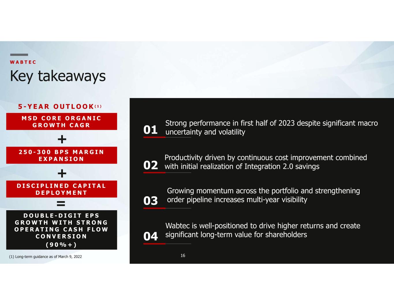 15 Adjusted operating margin up - Favorable productivity/absorption offset by mix - SG&A as % of sales down - Engineering as % of sales flat W A B T E C 2023 updated financial guidance(1) (1) See Forward looking statements and non-GAAP financial information (2) Cash from operations conversion % is defined as GAAP cash from operations divided by GAAP net income plus depreciation and amortization including deferred debt cost amortization STRONG MOMENTUM ACROSS THE PORTFOLIO K E Y A S S U M P T I O N S Tax rate ~25.5% Capex ~2% of sales R E V E N U E S $8.7B to $9.0B A D J U S T E D E P S $5.15 to $5.55 C A S H C O N V E R S I O N (2) >90% UPDATED GUIDANCEPRIOR GUIDANCE R E V E N U E S $9.25B to $9.50B A D J U S T E D E P S $5.50 to $5.80 C A S H C O N V E R S I O N (2) >90%