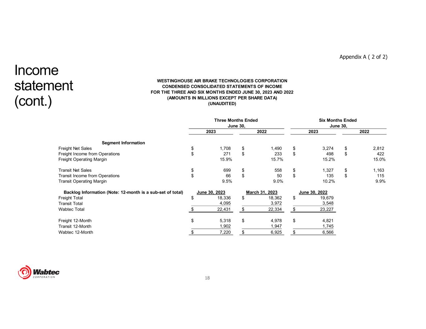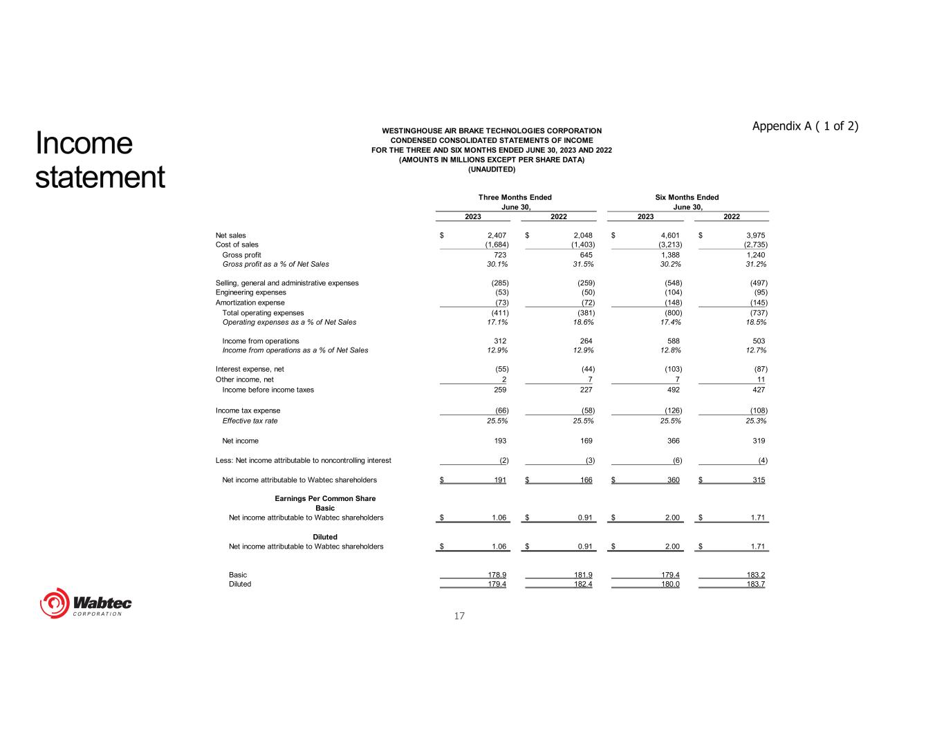 17 2023 2022 2023 2022 Net sales 2,407$ 2,048$ 4,601$ 3,975$ Cost of sales (1,684) (1,403) (3,213) (2,735) Gross profit 723 645 1,388 1,240 Gross profit as a % of Net Sales 30.1% 31.5% 30.2% 31.2% Selling, general and administrative expenses (285) (259) (548) (497) Engineering expenses (53) (50) (104) (95) Amortization expense (73) (72) (148) (145) Total operating expenses (411) (381) (800) (737) Operating expenses as a % of Net Sales 17.1% 18.6% 17.4% 18.5% Income from operations 312 264 588 503 Income from operations as a % of Net Sales 12.9% 12.9% 12.8% 12.7% Interest expense, net (55) (44) (103) (87) Other income, net 2 7 7 11 Income before income taxes 259 227 492 427 Income tax expense (66) (58) (126) (108) Effective tax rate 25.5% 25.5% 25.5% 25.3% Net income 193 169 366 319 Less: Net income attributable to noncontrolling interest (2) (3) (6) (4) Net income attributable to Wabtec shareholders 191$ 166$ 360$ 315$ Earnings Per Common Share Basic Net income attributable to Wabtec shareholders 1.06$ 0.91$ 2.00$ 1.71$ Diluted Net income attributable to Wabtec shareholders 1.06$ 0.91$ 2.00$ 1.71$ Basic 178.9 181.9 179.4 183.2 Diluted 179.4 182.4 180.0 183.7 Three Months Ended Six Months Ended June 30, June 30, WESTINGHOUSE AIR BRAKE TECHNOLOGIES CORPORATION CONDENSED CONSOLIDATED STATEMENTS OF INCOME FOR THE THREE AND SIX MONTHS ENDED JUNE 30, 2023 AND 2022 (AMOUNTS IN MILLIONS EXCEPT PER SHARE DATA) (UNAUDITED) Income statement Appendix A ( 1 of 2)