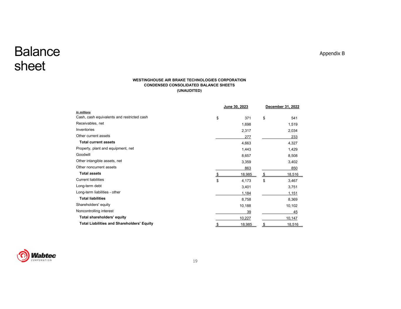 19 WESTINGHOUSE AIR BRAKE TECHNOLOGIES CORPORATION CONDENSED CONSOLIDATED BALANCE SHEETS (UNAUDITED) June 30, 2023 December 31, 2022 In millions Cash, cash equivalents and restricted cash $ 371 $ 541 Receivables, net 1,698 1,519 Inventories 2,317 2,034 Other current assets 277 233 Total current assets 4,663 4,327 Property, plant and equipment, net 1,443 1,429 Goodwill 8,657 8,508 Other intangible assets, net 3,359 3,402 Other noncurrent assets 863 850 Total assets $ 18,985 $ 18,516 Current liabilities $ 4,173 $ 3,467 Long-term debt 3,401 3,751 Long-term liabilities - other 1,184 1,151 Total liabilities 8,758 8,369 Shareholders' equity 10,188 10,102 Noncontrolling interest 39 45 Total shareholders' equity 10,227 10,147 Total Liabilities and Shareholders' Equity $ 18,985 $ 18,516 Balance sheet Appendix B