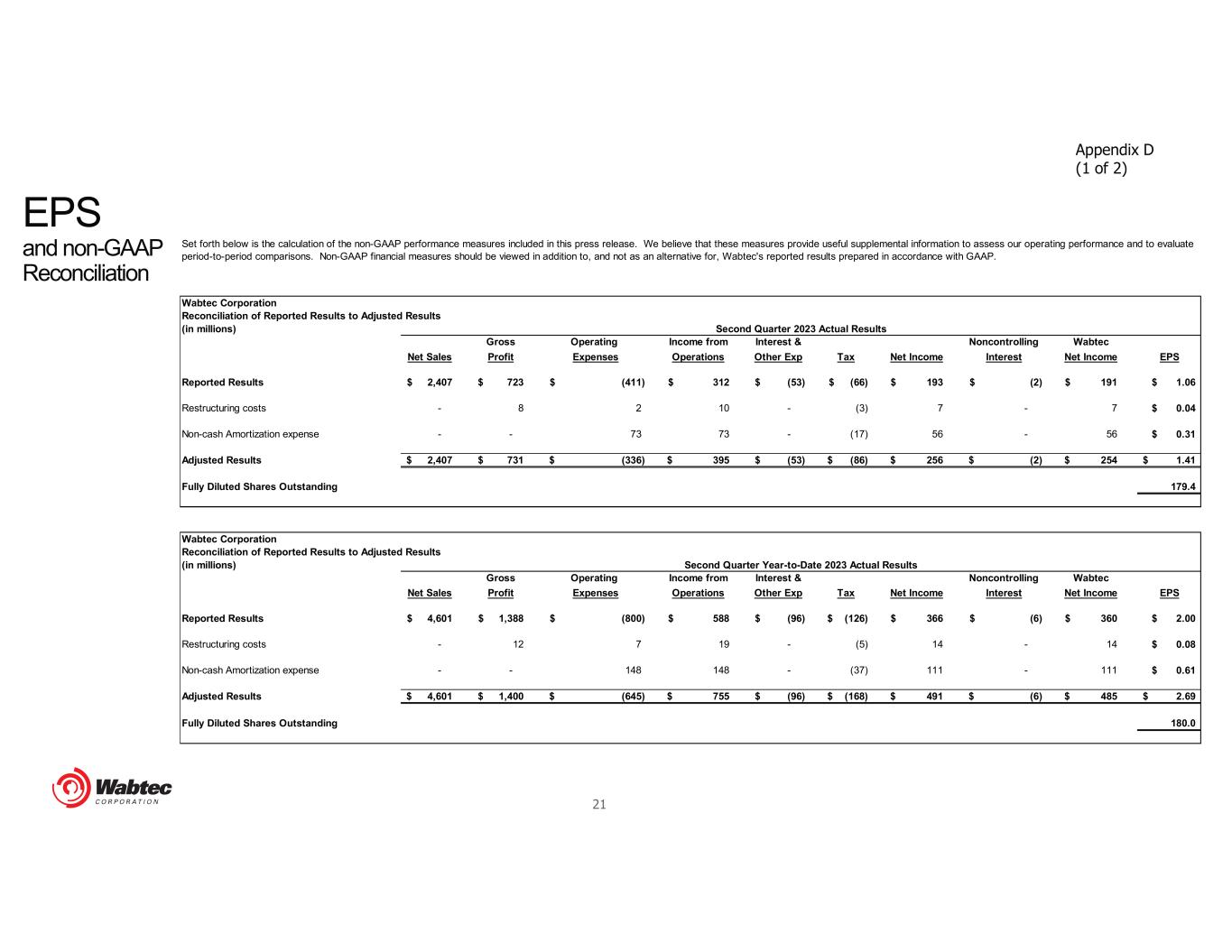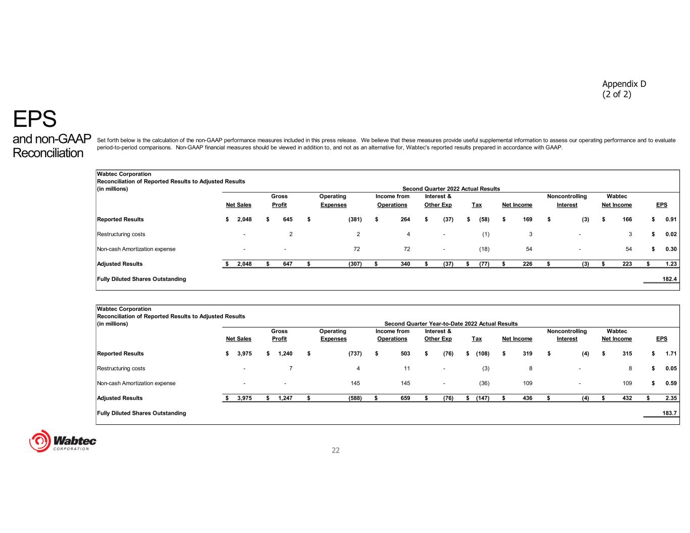 21 EPS and non-GAAP Reconciliation Appendix D (1 of 2) Wabtec Corporation Reconciliation of Reported Results to Adjusted Results (in millions) Gross Operating Income from Interest & Noncontrolling Wabtec Net Sales Profit Expenses Operations Other Exp Tax Net Income Interest Net Income EPS Reported Results 2,407$ 723$ (411)$ 312$ (53)$ (66)$ 193$ (2)$ 191$ 1.06$ Restructuring costs - 8 2 10 - (3) 7 - 7 0.04$ Non-cash Amortization expense - - 73 73 - (17) 56 - 56 0.31$ Adjusted Results 2,407$ 731$ (336)$ 395$ (53)$ (86)$ 256$ (2)$ 254$ 1.41$ Fully Diluted Shares Outstanding 179.4 Wabtec Corporation Reconciliation of Reported Results to Adjusted Results (in millions) Gross Operating Income from Interest & Noncontrolling Wabtec Net Sales Profit Expenses Operations Other Exp Tax Net Income Interest Net Income EPS Reported Results 4,601$ 1,388$ (800)$ 588$ (96)$ (126)$ 366$ (6)$ 360$ 2.00$ Restructuring costs - 12 7 19 - (5) 14 - 14 0.08$ Non-cash Amortization expense - - 148 148 - (37) 111 - 111 0.61$ Adjusted Results 4,601$ 1,400$ (645)$ 755$ (96)$ (168)$ 491$ (6)$ 485$ 2.69$ Fully Diluted Shares Outstanding 180.0 Second Quarter Year-to-Date 2023 Actual Results Set forth below is the calculation of the non-GAAP performance measures included in this press release. We believe that these measures provide useful supplemental information to assess our operating performance and to evaluate period-to-period comparisons. Non-GAAP financial measures should be viewed in addition to, and not as an alternative for, Wabtec's reported results prepared in accordance with GAAP. Second Quarter 2023 Actual Results