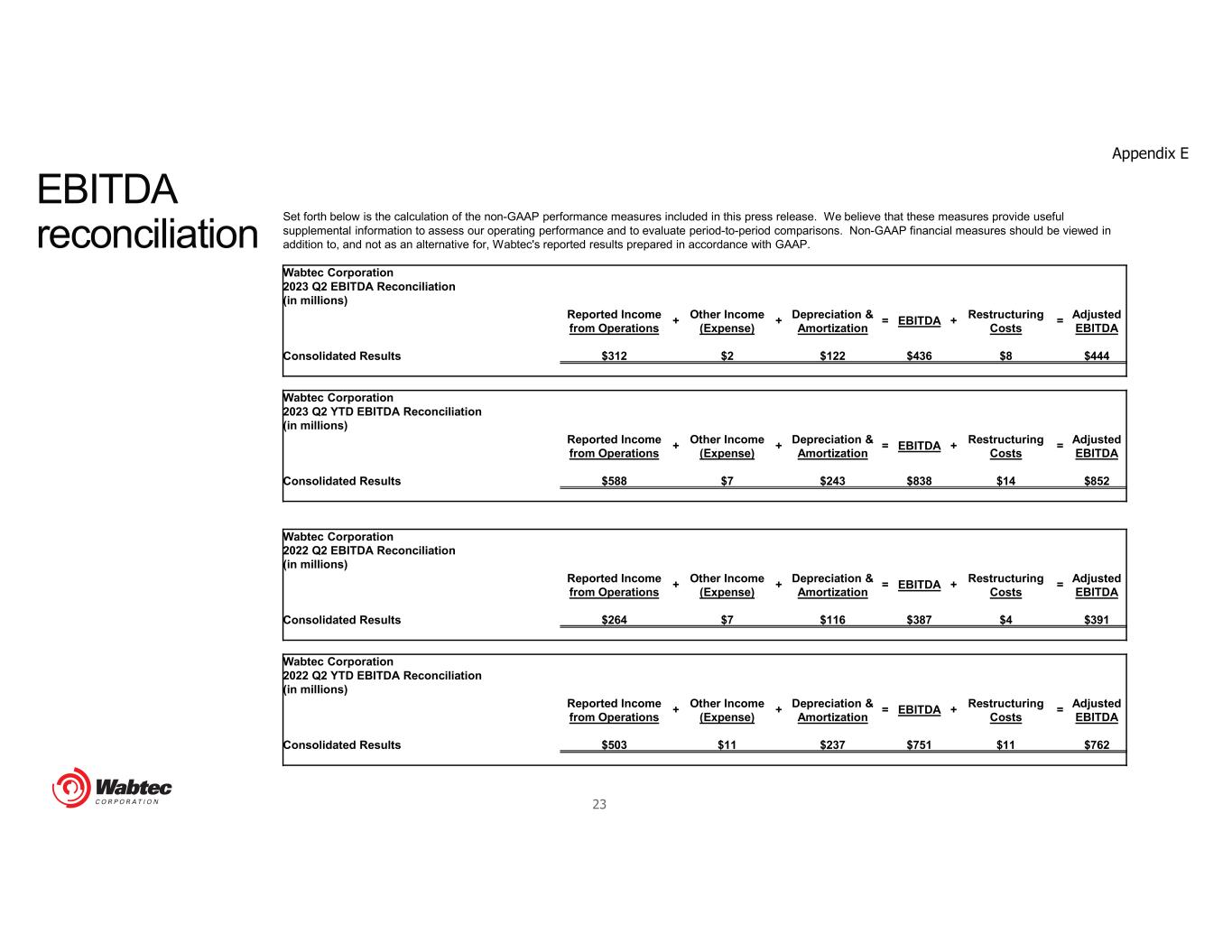23 Set forth below is the calculation of the non-GAAP performance measures included in this press release. We believe that these measures provide useful supplemental information to assess our operating performance and to evaluate period-to-period comparisons. Non-GAAP financial measures should be viewed in addition to, and not as an alternative for, Wabtec's reported results prepared in accordance with GAAP. Wabtec Corporation 2023 Q2 EBITDA Reconciliation (in millions) Reported Income + Other Income + Depreciation & = EBITDA + Restructuring = Adjusted from Operations (Expense) Amortization Costs EBITDA Consolidated Results $312 $2 $122 $436 $8 $444 Wabtec Corporation 2023 Q2 YTD EBITDA Reconciliation (in millions) Reported Income + Other Income + Depreciation & = EBITDA + Restructuring = Adjusted from Operations (Expense) Amortization Costs EBITDA Consolidated Results $588 $7 $243 $838 $14 $852 Wabtec Corporation 2022 Q2 EBITDA Reconciliation (in millions) Reported Income + Other Income + Depreciation & = EBITDA + Restructuring = Adjusted from Operations (Expense) Amortization Costs EBITDA Consolidated Results $264 $7 $116 $387 $4 $391 Wabtec Corporation 2022 Q2 YTD EBITDA Reconciliation (in millions) Reported Income + Other Income + Depreciation & = EBITDA + Restructuring = Adjusted from Operations (Expense) Amortization Costs EBITDA Consolidated Results $503 $11 $237 $751 $11 $762 EBITDA reconciliation Appendix E