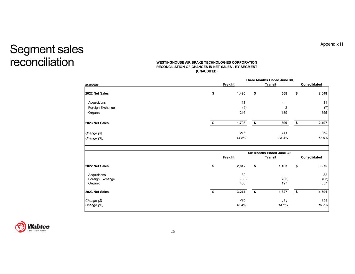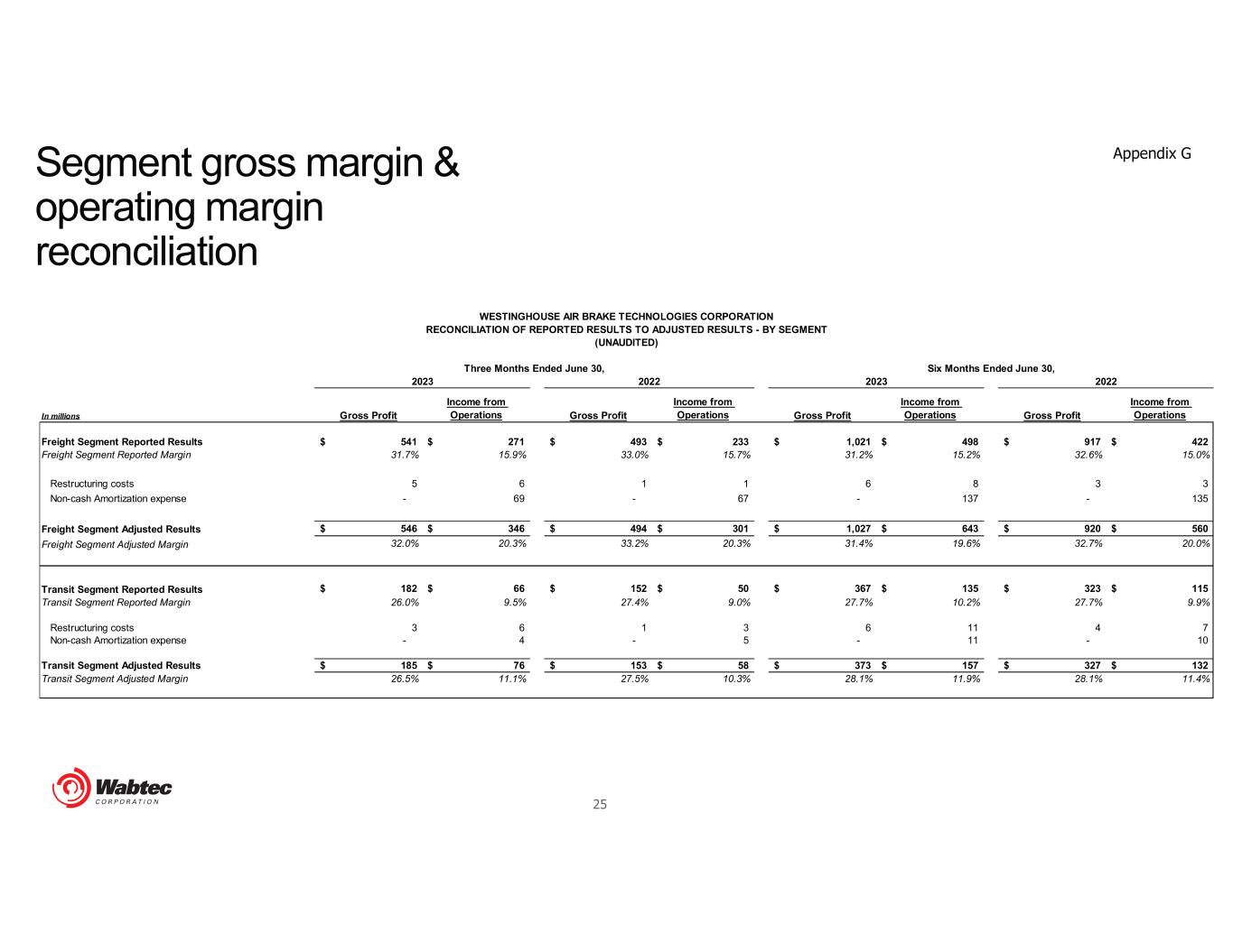 25 In millions Gross Profit Income from Operations Gross Profit Income from Operations Gross Profit Income from Operations Gross Profit Income from Operations Freight Segment Reported Results 541$ 271$ 493$ 233$ 1,021$ 498$ 917$ 422$ Freight Segment Reported Margin 31.7% 15.9% 33.0% 15.7% 31.2% 15.2% 32.6% 15.0% Restructuring costs 5 6 1 1 6 8 3 3 Non-cash Amortization expense - 69 - 67 - 137 - 135 Freight Segment Adjusted Results 546$ 346$ 494$ 301$ 1,027$ 643$ 920$ 560$ Freight Segment Adjusted Margin 32.0% 20.3% 33.2% 20.3% 31.4% 19.6% 32.7% 20.0% Transit Segment Reported Results 182$ 66$ 152$ 50$ 367$ 135$ 323$ 115$ Transit Segment Reported Margin 26.0% 9.5% 27.4% 9.0% 27.7% 10.2% 27.7% 9.9% Restructuring costs 3 6 1 3 6 11 4 7 Non-cash Amortization expense - 4 - 5 - 11 - 10 Transit Segment Adjusted Results 185$ 76$ 153$ 58$ 373$ 157$ 327$ 132$ Transit Segment Adjusted Margin 26.5% 11.1% 27.5% 10.3% 28.1% 11.9% 28.1% 11.4% WESTINGHOUSE AIR BRAKE TECHNOLOGIES CORPORATION RECONCILIATION OF REPORTED RESULTS TO ADJUSTED RESULTS - BY SEGMENT (UNAUDITED) 2023 2022 Three Months Ended June 30, Six Months Ended June 30, 2023 2022 Segment gross margin & operating margin reconciliation Appendix G
