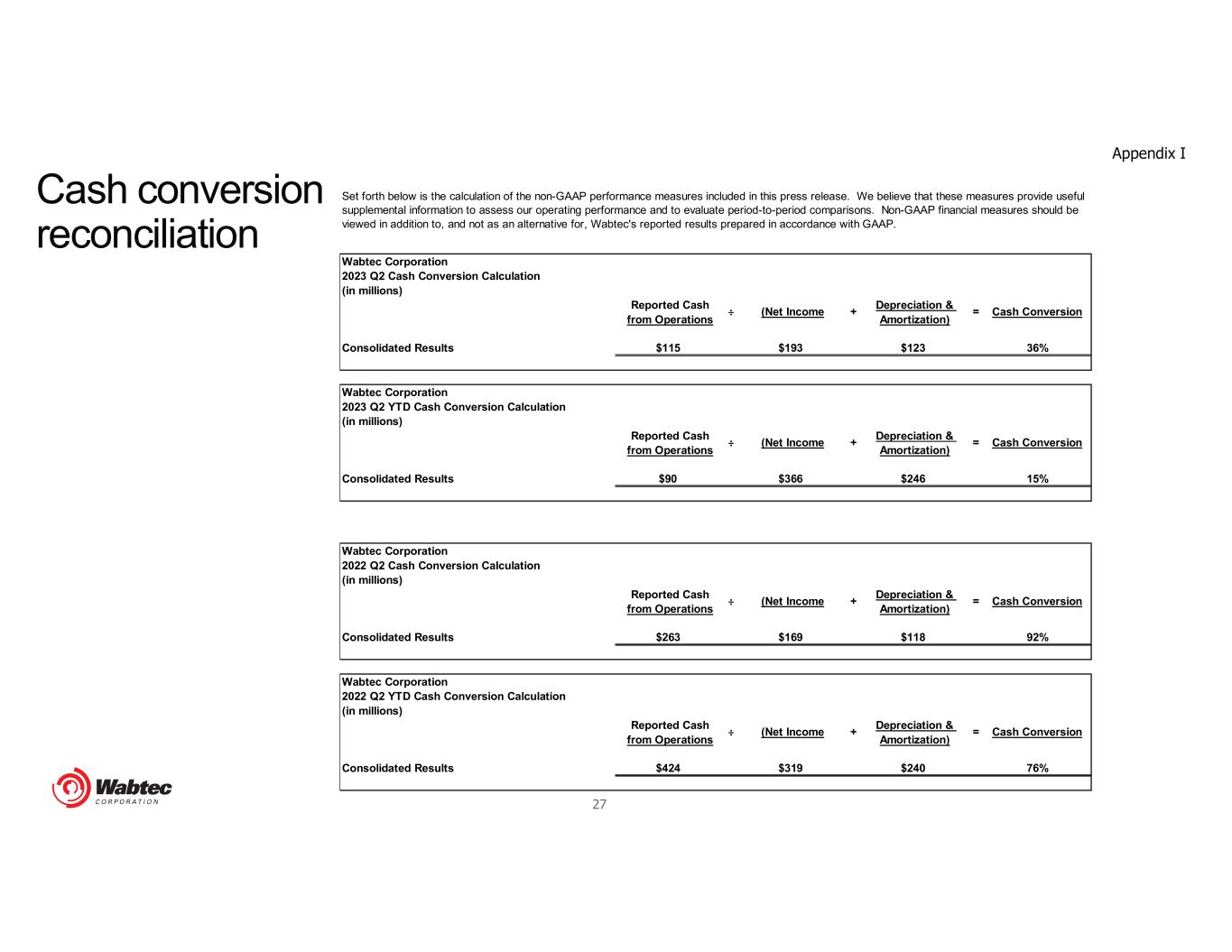 27 Cash conversion reconciliation Appendix I Wabtec Corporation 2023 Q2 Cash Conversion Calculation (in millions) Reported Cash from Operations Consolidated Results $115 $193 $123 36% Wabtec Corporation 2023 Q2 YTD Cash Conversion Calculation (in millions) Reported Cash from Operations Consolidated Results $90 $366 $246 15% Wabtec Corporation 2022 Q2 Cash Conversion Calculation (in millions) Reported Cash from Operations Consolidated Results $263 $169 $118 92% Wabtec Corporation 2022 Q2 YTD Cash Conversion Calculation (in millions) Reported Cash from Operations Consolidated Results $424 $319 $240 76% Cash Conversion Set forth below is the calculation of the non-GAAP performance measures included in this press release. We believe that these measures provide useful supplemental information to assess our operating performance and to evaluate period-to-period comparisons. Non-GAAP financial measures should be viewed in addition to, and not as an alternative for, Wabtec's reported results prepared in accordance with GAAP. ÷ (Net Income + Depreciation & Amortization) = Cash Conversion ÷ (Net Income + Depreciation & Amortization) = Cash Conversion ÷ (Net Income + Depreciation & Amortization) = Cash Conversion ÷ (Net Income + Depreciation & Amortization) =