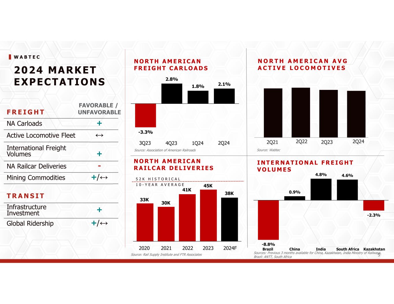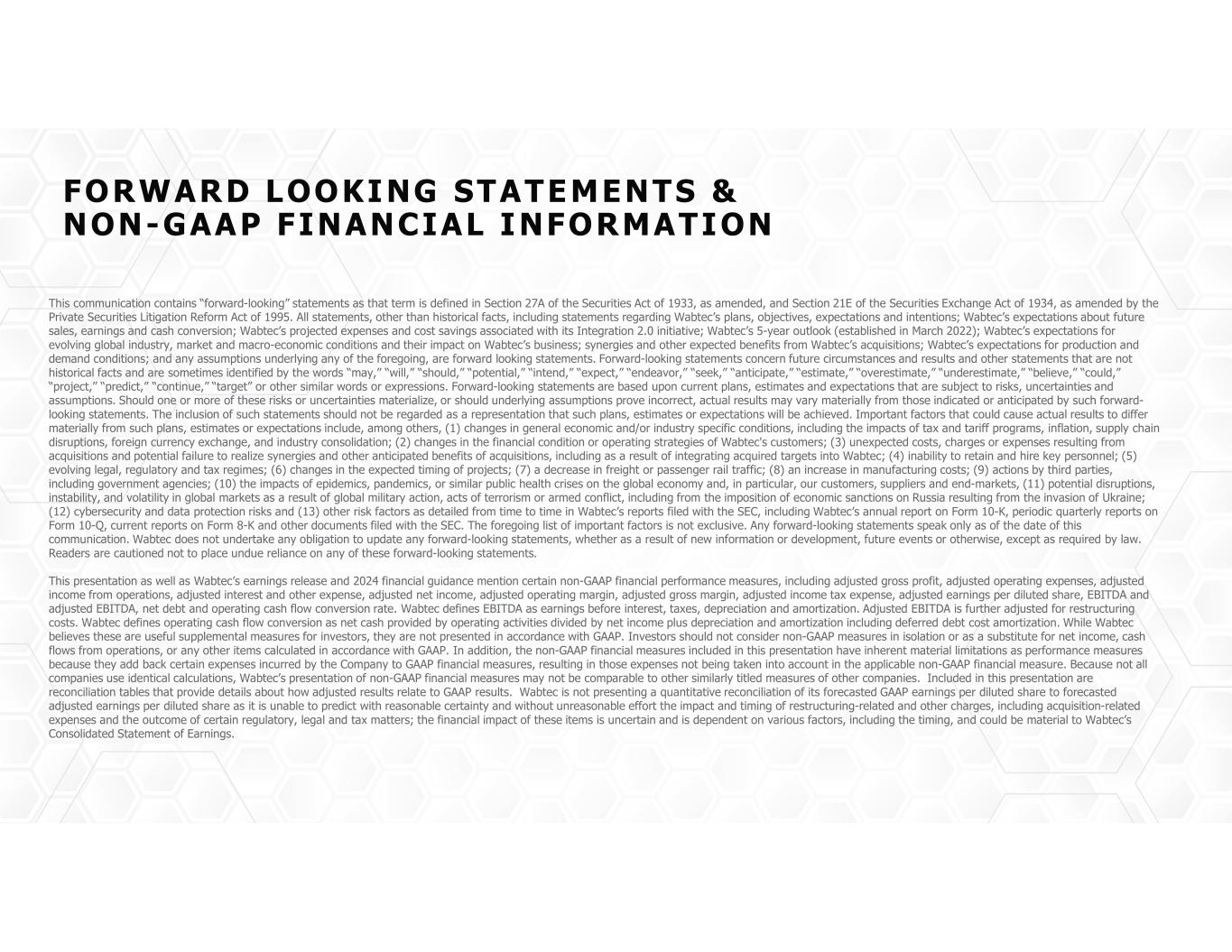 FORWARD LOOKING STATEMENTS & NON-GAAP FINANCIAL INFORMATION This communication contains “forward-looking” statements as that term is defined in Section 27A of the Securities Act of 1933, as amended, and Section 21E of the Securities Exchange Act of 1934, as amended by the Private Securities Litigation Reform Act of 1995. All statements, other than historical facts, including statements regarding Wabtec’s plans, objectives, expectations and intentions; Wabtec’s expectations about future sales, earnings and cash conversion; Wabtec’s projected expenses and cost savings associated with its Integration 2.0 initiative; Wabtec’s 5-year outlook (established in March 2022); Wabtec’s expectations for evolving global industry, market and macro-economic conditions and their impact on Wabtec’s business; synergies and other expected benefits from Wabtec’s acquisitions; Wabtec’s expectations for production and demand conditions; and any assumptions underlying any of the foregoing, are forward looking statements. Forward-looking statements concern future circumstances and results and other statements that are not historical facts and are sometimes identified by the words “may,” “will,” “should,” “potential,” “intend,” “expect,” “endeavor,” “seek,” “anticipate,” “estimate,” “overestimate,” “underestimate,” “believe,” “could,” “project,” “predict,” “continue,” “target” or other similar words or expressions. Forward-looking statements are based upon current plans, estimates and expectations that are subject to risks, uncertainties and assumptions. Should one or more of these risks or uncertainties materialize, or should underlying assumptions prove incorrect, actual results may vary materially from those indicated or anticipated by such forward- looking statements. The inclusion of such statements should not be regarded as a representation that such plans, estimates or expectations will be achieved. Important factors that could cause actual results to differ materially from such plans, estimates or expectations include, among others, (1) changes in general economic and/or industry specific conditions, including the impacts of tax and tariff programs, inflation, supply chain disruptions, foreign currency exchange, and industry consolidation; (2) changes in the financial condition or operating strategies of Wabtec's customers; (3) unexpected costs, charges or expenses resulting from acquisitions and potential failure to realize synergies and other anticipated benefits of acquisitions, including as a result of integrating acquired targets into Wabtec; (4) inability to retain and hire key personnel; (5) evolving legal, regulatory and tax regimes; (6) changes in the expected timing of projects; (7) a decrease in freight or passenger rail traffic; (8) an increase in manufacturing costs; (9) actions by third parties, including government agencies; (10) the impacts of epidemics, pandemics, or similar public health crises on the global economy and, in particular, our customers, suppliers and end-markets, (11) potential disruptions, instability, and volatility in global markets as a result of global military action, acts of terrorism or armed conflict, including from the imposition of economic sanctions on Russia resulting from the invasion of Ukraine; (12) cybersecurity and data protection risks and (13) other risk factors as detailed from time to time in Wabtec’s reports filed with the SEC, including Wabtec’s annual report on Form 10-K, periodic quarterly reports on Form 10-Q, current reports on Form 8-K and other documents filed with the SEC. The foregoing list of important factors is not exclusive. Any forward-looking statements speak only as of the date of this communication. Wabtec does not undertake any obligation to update any forward-looking statements, whether as a result of new information or development, future events or otherwise, except as required by law. Readers are cautioned not to place undue reliance on any of these forward-looking statements. This presentation as well as Wabtec’s earnings release and 2024 financial guidance mention certain non-GAAP financial performance measures, including adjusted gross profit, adjusted operating expenses, adjusted income from operations, adjusted interest and other expense, adjusted net income, adjusted operating margin, adjusted gross margin, adjusted income tax expense, adjusted earnings per diluted share, EBITDA and adjusted EBITDA, net debt and operating cash flow conversion rate. Wabtec defines EBITDA as earnings before interest, taxes, depreciation and amortization. Adjusted EBITDA is further adjusted for restructuring costs. Wabtec defines operating cash flow conversion as net cash provided by operating activities divided by net income plus depreciation and amortization including deferred debt cost amortization. While Wabtec believes these are useful supplemental measures for investors, they are not presented in accordance with GAAP. Investors should not consider non-GAAP measures in isolation or as a substitute for net income, cash flows from operations, or any other items calculated in accordance with GAAP. In addition, the non-GAAP financial measures included in this presentation have inherent material limitations as performance measures because they add back certain expenses incurred by the Company to GAAP financial measures, resulting in those expenses not being taken into account in the applicable non-GAAP financial measure. Because not all companies use identical calculations, Wabtec’s presentation of non-GAAP financial measures may not be comparable to other similarly titled measures of other companies. Included in this presentation are reconciliation tables that provide details about how adjusted results relate to GAAP results. Wabtec is not presenting a quantitative reconciliation of its forecasted GAAP earnings per diluted share to forecasted ad