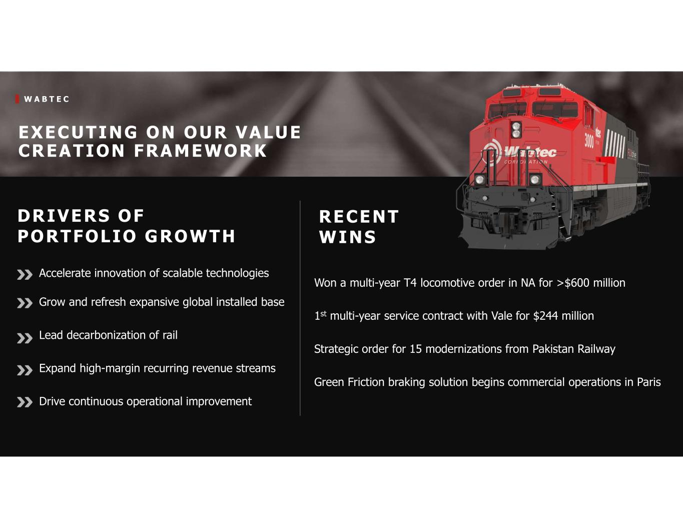 W A B T E C EXECUTING ON OUR VALUE CREATION FRAMEWORK DRIVERS OF PORTFOLIO GROWTH RECENT WINS Won a multi-year T4 locomotive order in NA for >$600 million 1st multi-year service contract with Vale for $244 million Strategic order for 15 modernizations from Pakistan Railway Green Friction braking solution begins commercial operations in Paris Accelerate innovation of scalable technologies Grow and refresh expansive global installed base Lead decarbonization of rail Expand high-margin recurring revenue streams Drive continuous operational improvement