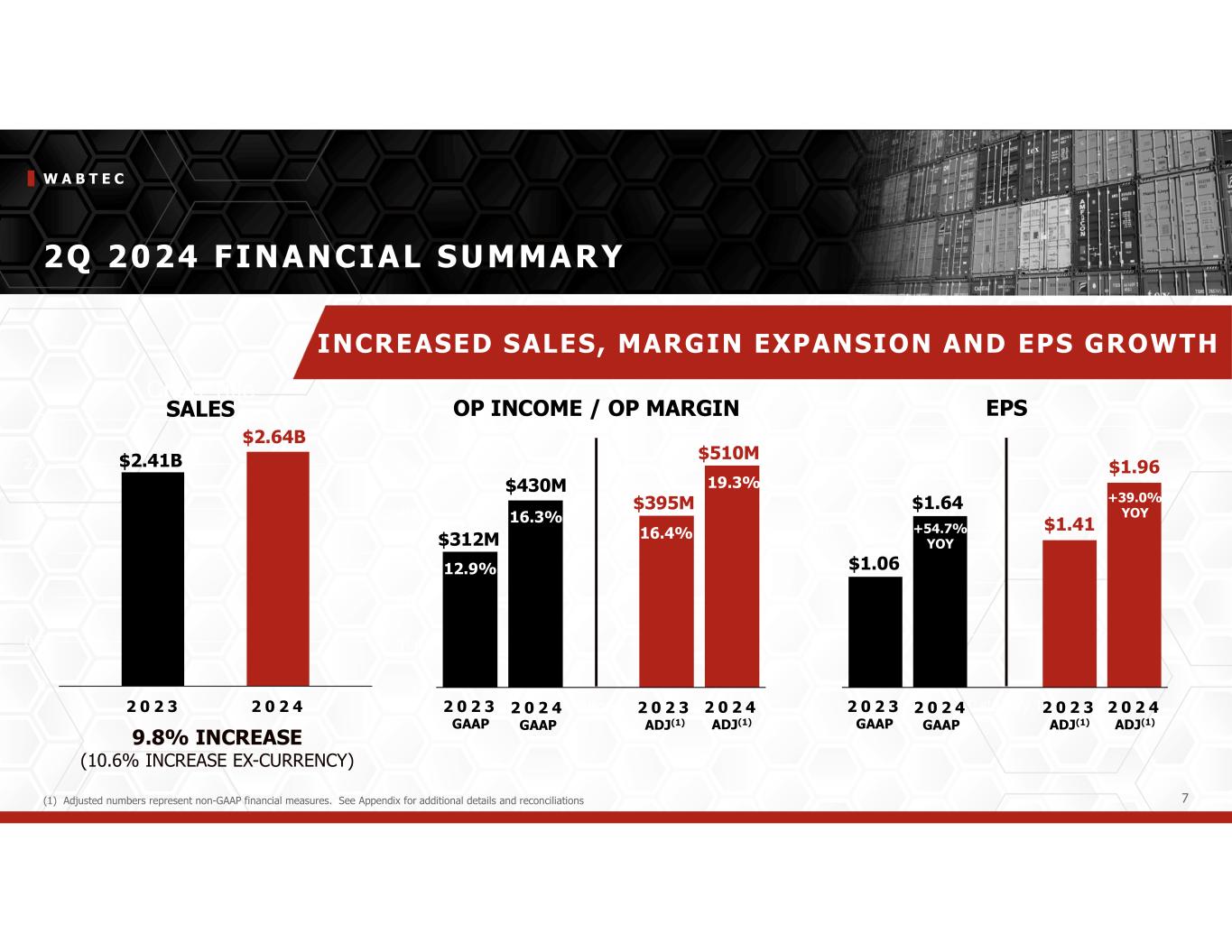 W A B T E C 4 2Q 2024 OVERVIEW Up 9.8% YOY$ 2 . 6 4 BS A L E S 1 9 . 3 % Adjusted 1 6 . 3 % G A A P O P E R A T I N G M A R G I N $ 1 . 9 6 Adjusted $ 1 . 6 4 G A A P E A R N I N G S P E R S H A R E $ 2 3 5 M C A S H F L O W F R O M O P E R A T I O N S ( 1 ) $ 7 . 3 3 B1 2 - M O N T H B A C K L O G S T R O N G E X E C U T I O N A N D M O M E N T U M A C R O S S T H E B U S I N E S S 2 Q 2 0 2 4 H I G H L I G H T S Increased sales were driven by strong growth in the Freight Segment of 13.1% Operating margin benefited from sales growth and improved gross margin GAAP EPS up 54.7% YoY … Adjusted EPS up 39.0% YoY from higher sales and operating margin expansion Operating cash flow of $235M vs $115M in year ago quarter. 1st half cash flow ahead of prior year by $479M Backlog continues to provide strong visibility Note: Adjusted numbers represent non-GAAP financial measures. See Appendix for additional details and reconciliations (1) The unfavorable impact from payments of accounts receivable securitization was $230 million in the 2nd quarter of 2024 and favorable impact from proceeds of $10 million in the prior year period