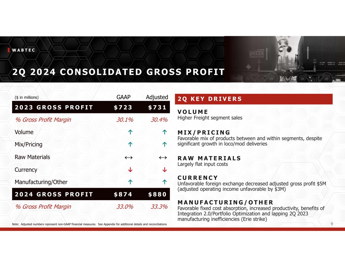 W A B T E C 8 2Q 2024 SALES (in millions) Y O Y2 Q 2 4P R O D U C T L I N E 36.4%$570Equipment 17.5%$322Components 2.1%$199Digital Intelligence 2.3%$829Services 13.1%$1,920Freight Segment 2.0%$724Transit Segment 9 . 8 %$ 2 , 6 4 4T O T A L S A L E S 2 Q K E Y D R I V E R S E Q U I P M E N T Higher locomotive deliveries and increased mining sales C O M P O N E N T S Increased demand for industrial products, higher international sales and the year-over-year impact of the L&M acquisition, partially offset by a lower North America railcar build (up 5.1% YoY excluding acquisitions) D I G I T A L I N T E L L I G E N C E Higher sales from International PTC, partially offset by lower North America sales S E R V I C E S Increased sales from overhauls and parts sales T R A N S I T Higher aftermarket sales … Sales up 3.4% on constant currency basis