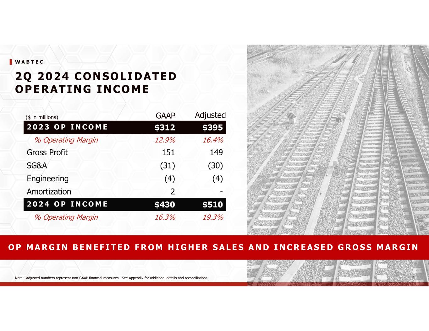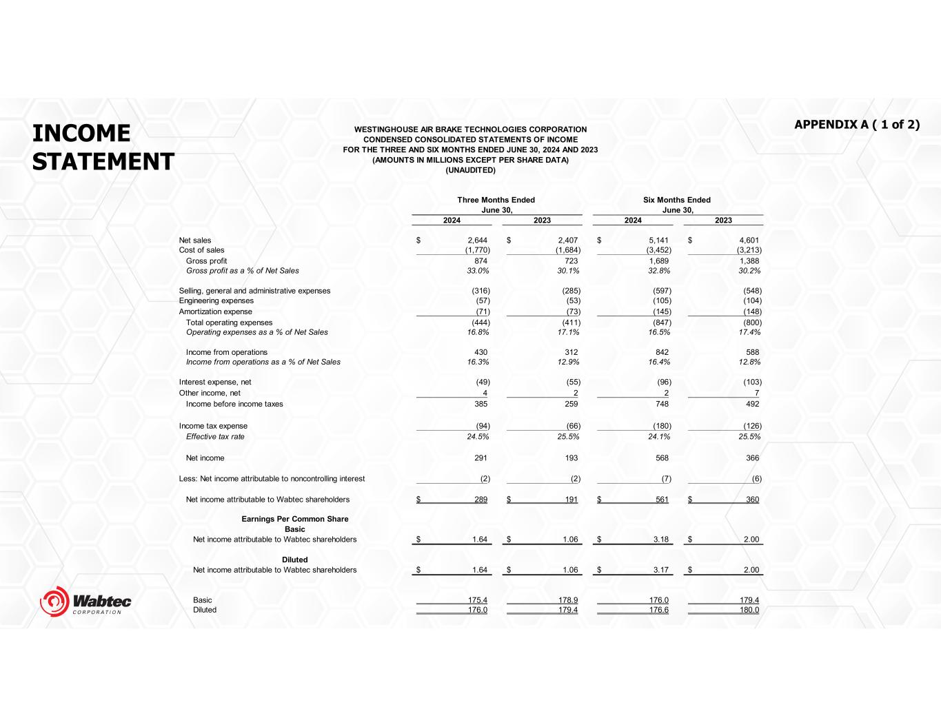 APPENDIX A ( 1 of 2)INCOME STATEMENT 2024 2023 2024 2023 Net sales 2,644$ 2,407$ 5,141$ 4,601$ Cost of sales (1,770) (1,684) (3,452) (3,213) Gross profit 874 723 1,689 1,388 Gross profit as a % of Net Sales 33.0% 30.1% 32.8% 30.2% Selling, general and administrative expenses (316) (285) (597) (548) Engineering expenses (57) (53) (105) (104) Amortization expense (71) (73) (145) (148) Total operating expenses (444) (411) (847) (800) Operating expenses as a % of Net Sales 16.8% 17.1% 16.5% 17.4% Income from operations 430 312 842 588 Income from operations as a % of Net Sales 16.3% 12.9% 16.4% 12.8% Interest expense, net (49) (55) (96) (103) Other income, net 4 2 2 7 Income before income taxes 385 259 748 492 Income tax expense (94) (66) (180) (126) Effective tax rate 24.5% 25.5% 24.1% 25.5% Net income 291 193 568 366 Less: Net income attributable to noncontrolling interest (2) (2) (7) (6) Net income attributable to Wabtec shareholders 289$ 191$ 561$ 360$ Earnings Per Common Share Basic Net income attributable to Wabtec shareholders 1.64$ 1.06$ 3.18$ 2.00$ Diluted Net income attributable to Wabtec shareholders 1.64$ 1.06$ 3.17$ 2.00$ Basic 175.4 178.9 176.0 179.4 Diluted 176.0 179.4 176.6 180.0 Three Months Ended Six Months Ended June 30, June 30, WESTINGHOUSE AIR BRAKE TECHNOLOGIES CORPORATION CONDENSED CONSOLIDATED STATEMENTS OF INCOME FOR THE THREE AND SIX MONTHS ENDED JUNE 30, 2024 AND 2023 (AMOUNTS IN MILLIONS EXCEPT PER SHARE DATA) (UNAUDITED)