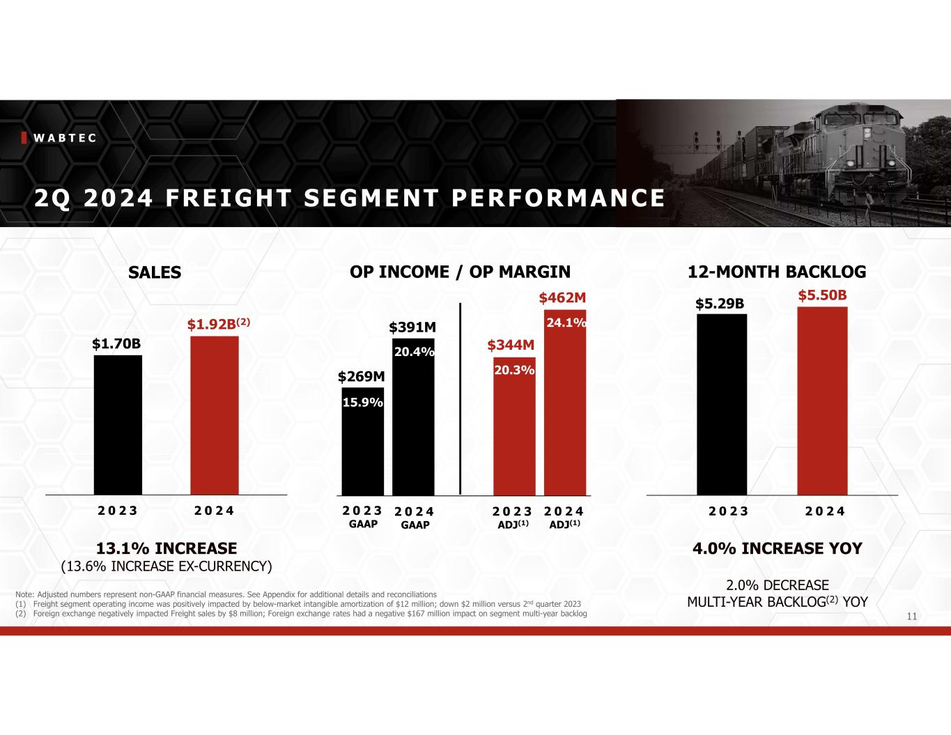 W A B T E C 10 2Q 2024 CONSOLIDATED OPERATING INCOME $395$3122 0 2 3 O P I N C O M E 16.4%12.9%% Operating Margin 149151Gross Profit (30)(31)SG&A (4)(4)Engineering -2Amortization $510$4302 0 2 4 O P I N C O M E 19.3%16.3%% Operating Margin O P M A R G I N B E N E F I T E D F R O M H I G H E R S A L E S A N D I N C R E A S E D G R O S S M A R G I N Adjusted ($ in millions) GAAP Note: Adjusted numbers represent non-GAAP financial measures. See Appendix for additional details and reconciliations