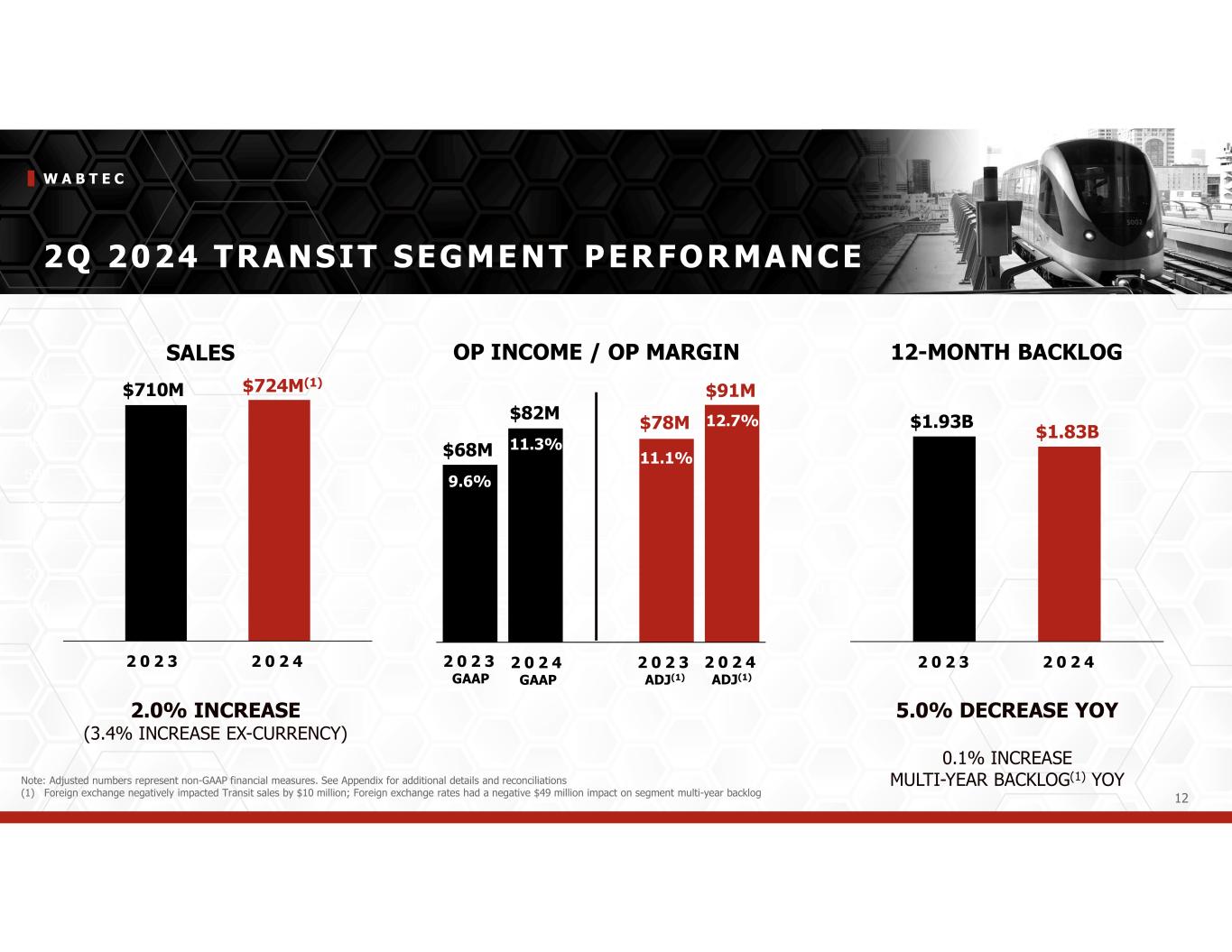 W A B T E C 11 0 1 2 3 4 5 6 Chart Title 0 0.5 1 1.5 2 2.5 Chart Title 2Q 2024 FREIGHT SEGMENT PERFORMANCE 0 50 100 150 200 250 300 350 400 450 500 Category 1 13.1% INCREASE (13.6% INCREASE EX-CURRENCY) SALES 2 0 2 3 2 0 2 4 2 0 2 3 GAAP 2 0 2 4 GAAP 2 0 2 3 ADJ(1) 2 0 2 4 ADJ(1) $269M 15.9% $391M 20.4% $344M 20.3% $462M 24.1% OP INCOME / OP MARGIN 12-MONTH BACKLOG $1.70B $1.92B(2) Note: Adjusted numbers represent non-GAAP financial measures. See Appendix for additional details and reconciliations (1) Freight segment operating income was positively impacted by below-market intangible amortization of $12 million; down $2 million versus 2nd quarter 2023 (2) Foreign exchange negatively impacted Freight sales by $8 million; Foreign exchange rates had a negative $167 million impact on segment multi-year backlog 4.0% INCREASE YOY 2.0% DECREASE MULTI-YEAR BACKLOG(2) YOY 2 0 2 3 2 0 2 4 $5.29B $5.50B