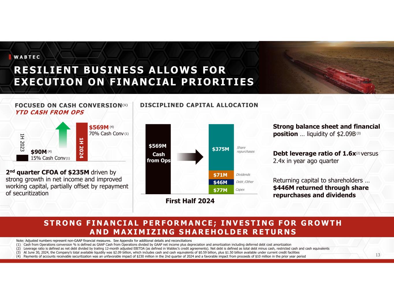 APPENDIX ICASH CONVERSION RECONCILIATION Wabtec Corporation 2024 Q2 Cash Conversion Calculation (in millions) Reported Cash from Operations Consolidated Results $235 $291 $118 57% Wabtec Corporation 2024 Q2 YTD Cash Conversion Calculation (in millions) Reported Cash from Operations Consolidated Results $569 $568 $241 70% Wabtec Corporation 2023 Q2 Cash Conversion Calculation (in millions) Reported Cash from Operations Consolidated Results $115 $193 $123 36% Wabtec Corporation 2023 Q2 YTD Cash Conversion Calculation (in millions) Reported Cash from Operations Consolidated Results $90 $366 $246 15% ÷ + = Cash Conversion(Net Income Depreciation & Amortization) ÷ + = Cash Conversion(Net Income Depreciation & Amortization) + = Cash Conversion(Net Income Depreciation & Amortization) Set forth below is the calculation of the non-GAAP performance measures included in this press release. We believe that these measures provide useful supplemental information to assess our operating performance and to evaluate period-to-period comparisons. Non-GAAP financial measures should be viewed in addition to, and not as an alternative for, Wabtec's reported results prepared in accordance with GAAP. ÷ + = Cash Conversion(Net Income Depreciation & Amortization)